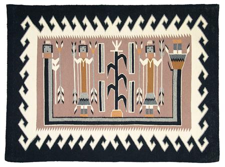 Circa 1960, Extra tight weave pictorial rug with vegetal and natural dyed homespun wool depicting two Yeis and cornstalk with rainbow god and hook element border. 3'2" x 2'6"