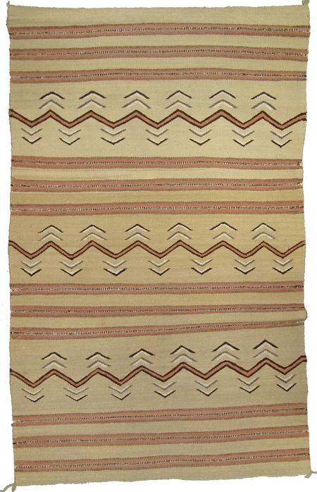 Ca. 1950s, Nice vintage fine weave banded Crystal rug with large wavy lines, floating stacked chevrons, and ticked bands. Very good condition, shows nice use. 4' 9" x 2' 11"
