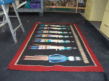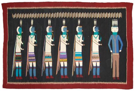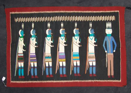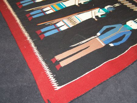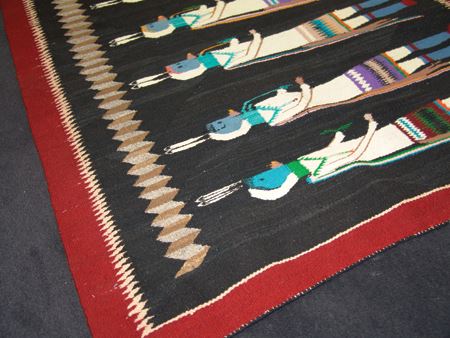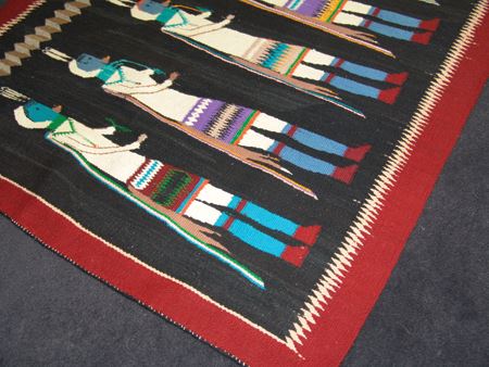 Ca. 1950s, Colorful vintage rug with blue-headed Yei Bei Chai  figures on a rare black field and with optical  and serrated features.  Very good condition, but  has some grazing and minor warp showing. 40" x 60"