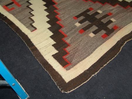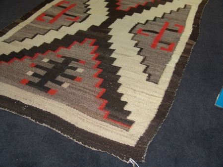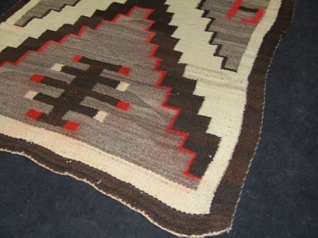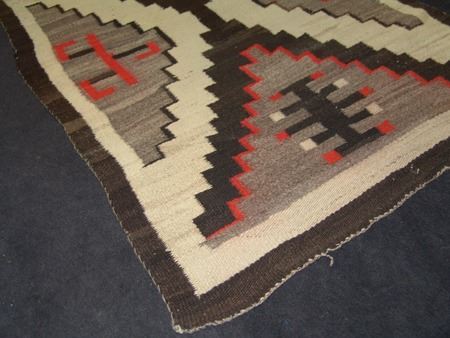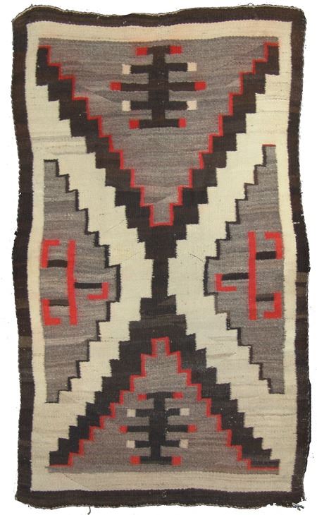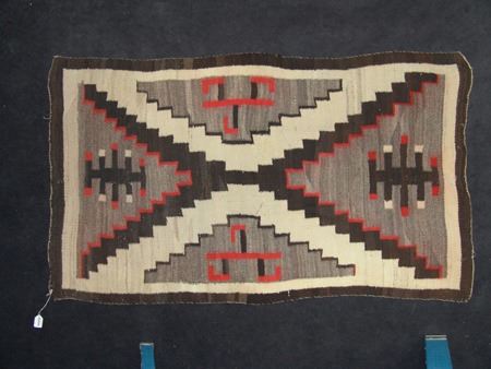 Ca. 1940s, Classic soft weave regional rug with large "X" and interesting geometric symbols. Good condition, an amateur repair and slight bleed. 40" x 67"