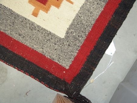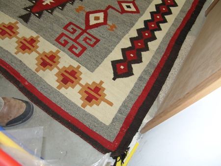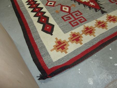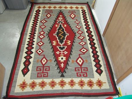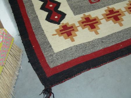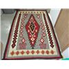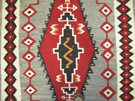 Ca. 1940s, Wonderful extra large Crystal rug with a great design featuring key hooks, diamond edge border, arrows, and a snake. Very good condition, tiny specks of the warp visible in areas. 8' x 62"
