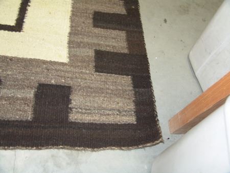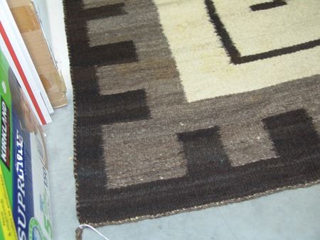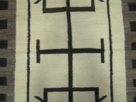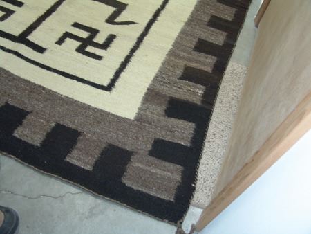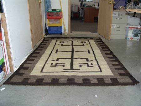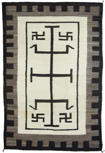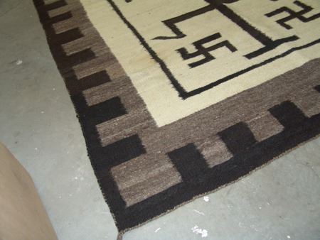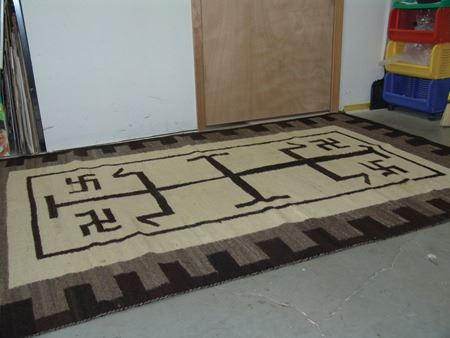 Ca. 1940, Large and sturdy vintage Crystal floor rug with fylfot crosses and unique geometric symbols. very good condition with some soiled areas. 94" x 60"