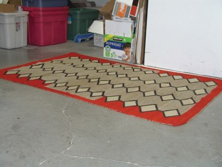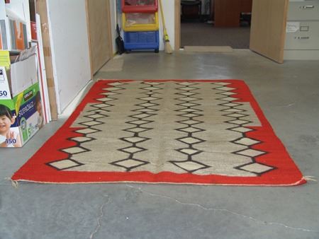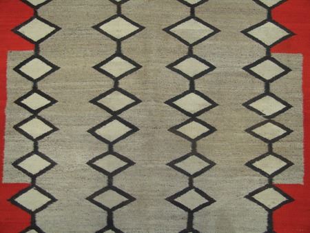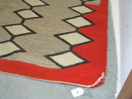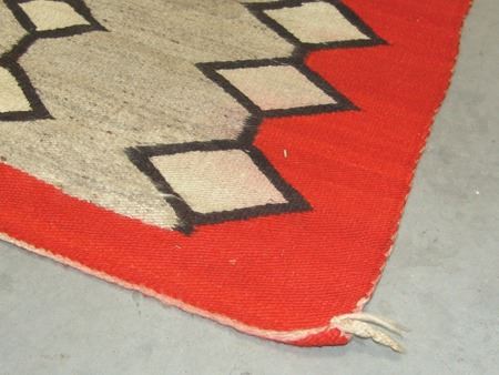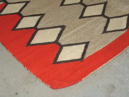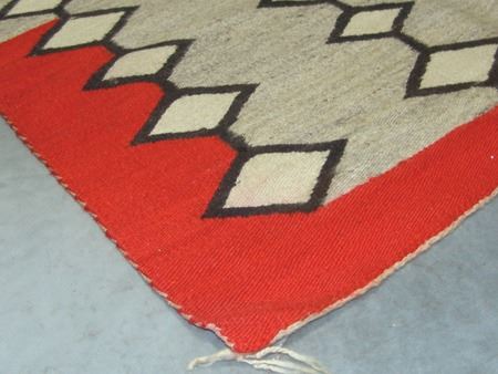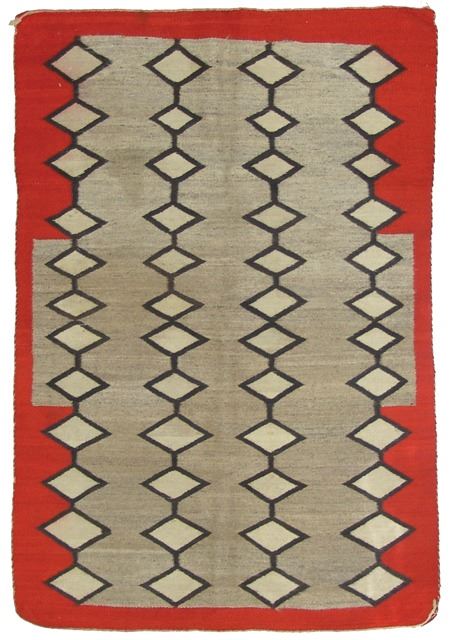 Ca. 1940s, Colorful all-wool floor rug with bright red border and rows of linked diamonds. Very good condition with some light soiling. 68" x 47"