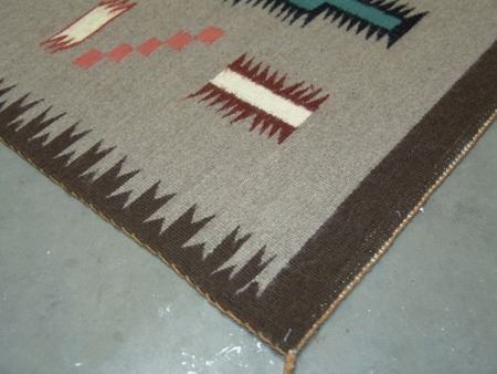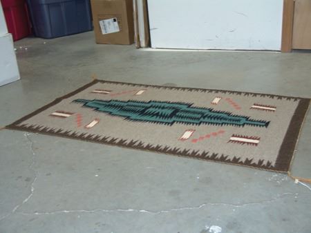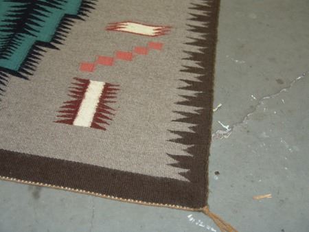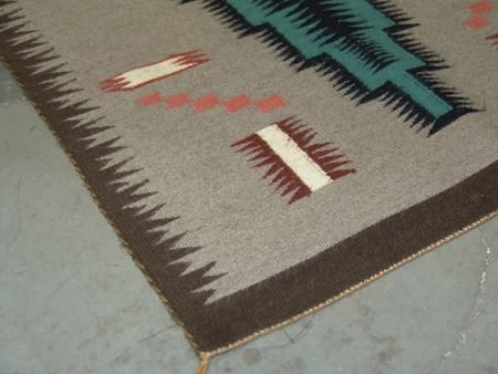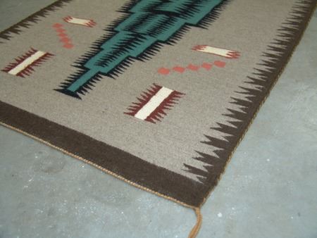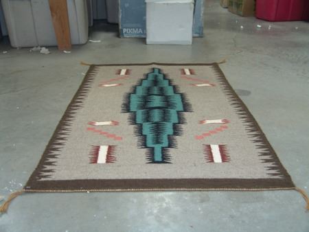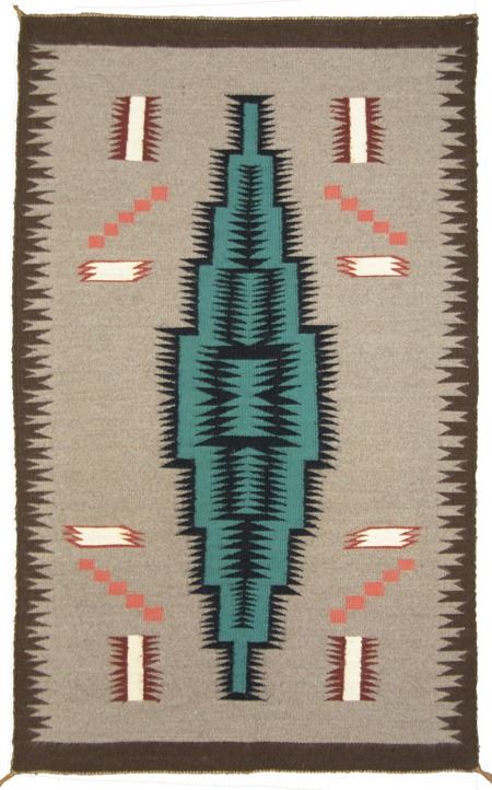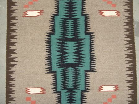 Ca. 1980s, Smaller fine weave Western Reservation table/floor rug with serrated teal central lozenge motif. Very good condition. 42" x 25"
