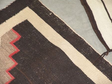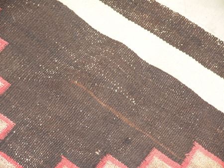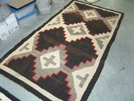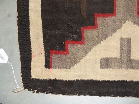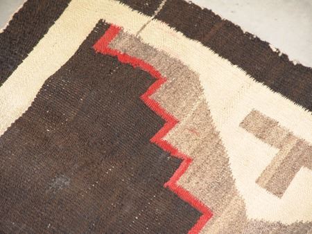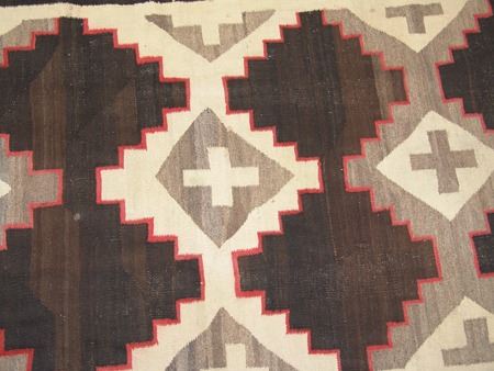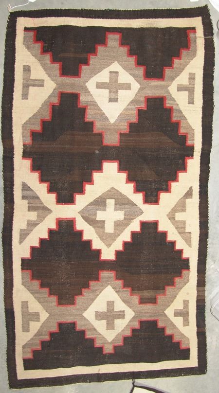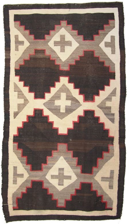 Ca. 1940s, Vintage Western Reservation rug with large black/brown stepped diamonds, crosses, and "T"s in its striking geometric design. Good condition, some exposed warp dots and minor bleed in one corner. 70" x 38"