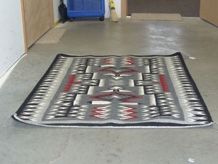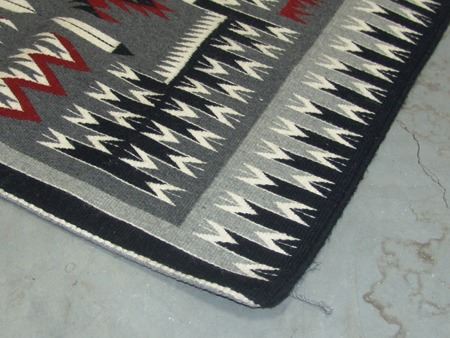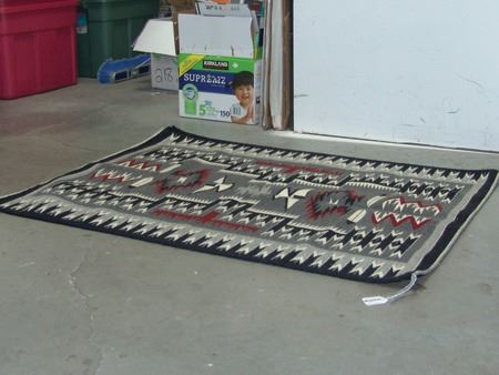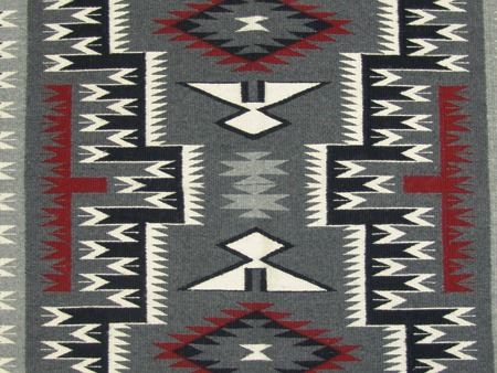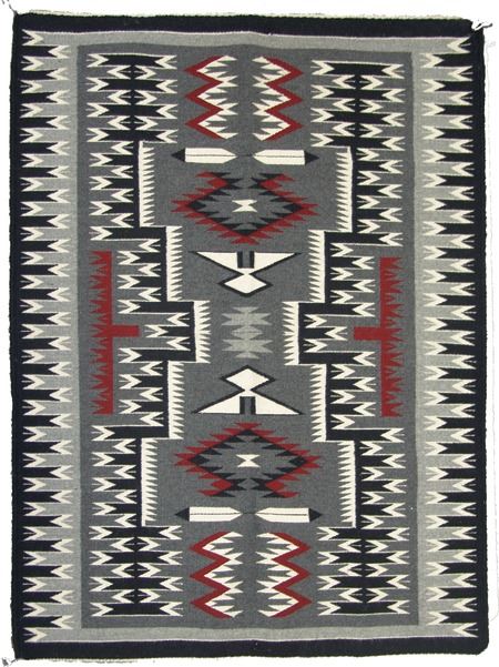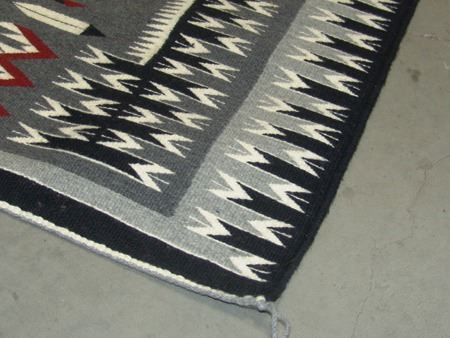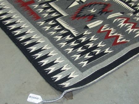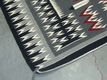 Ca. 1980s, Very fine weave elaborate storm pattern weaving with intricate serrated elements, plus eagle and feather symbols. Excellent condition. 36" x 46"