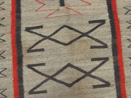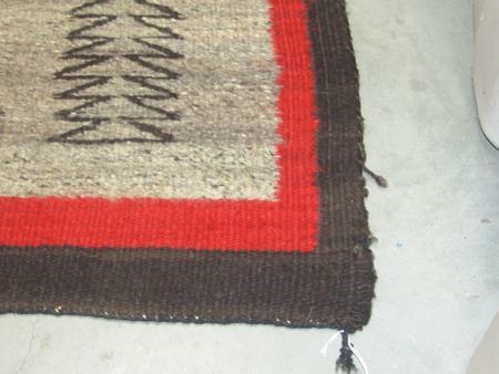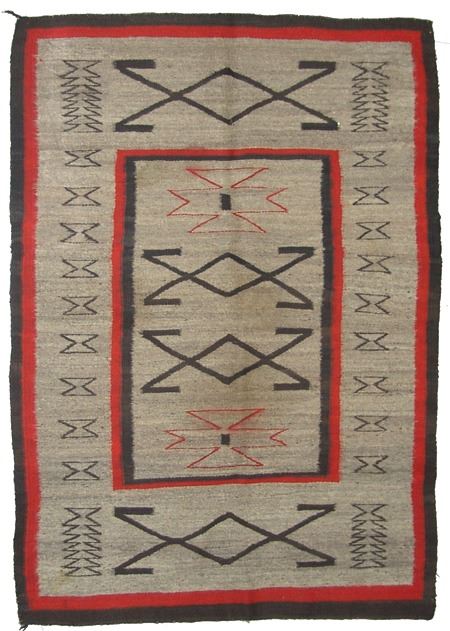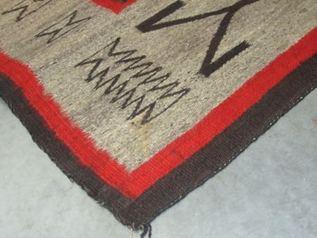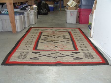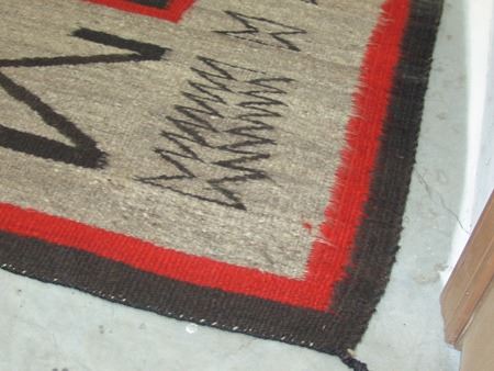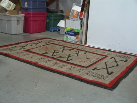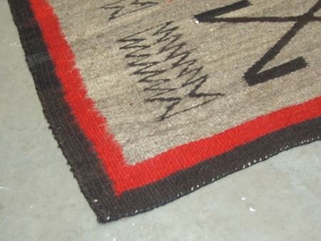 Ca. 1940s, Very heavy weave crystal floor rug with interesting figures and symbols. Good condition, sturdy, with some soiling and light bleed in one area. 74" x 52"