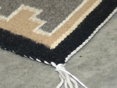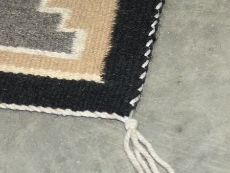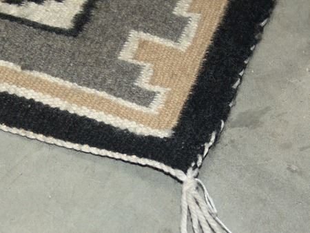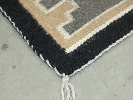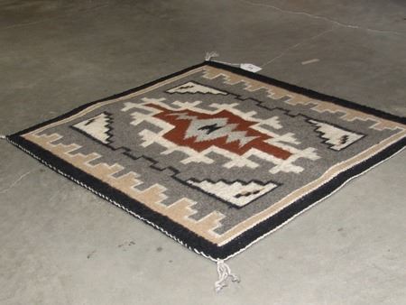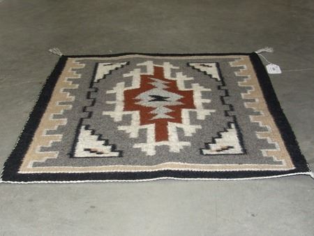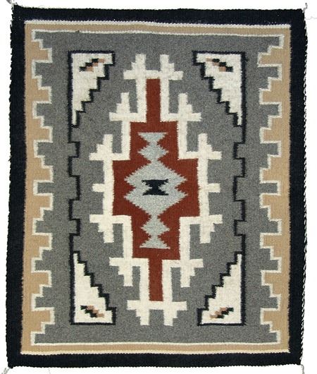 Ca. 1985, Very fine weave Two Grey Hills tapestry with traditional crisp earthtone geometric pattern. Very good condition. Nice table-top size. 23" x 19-1/2"