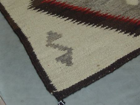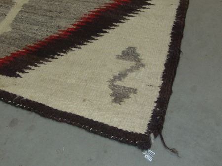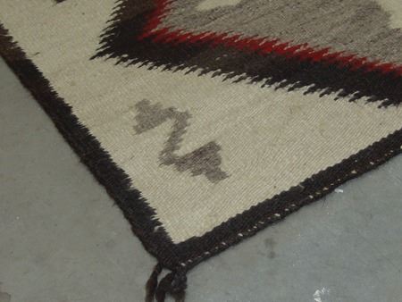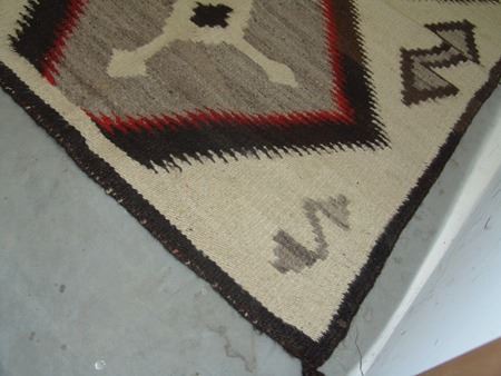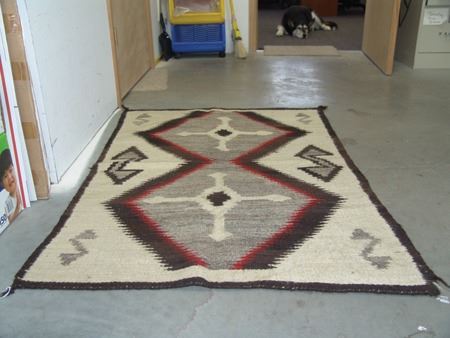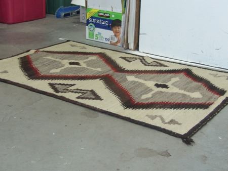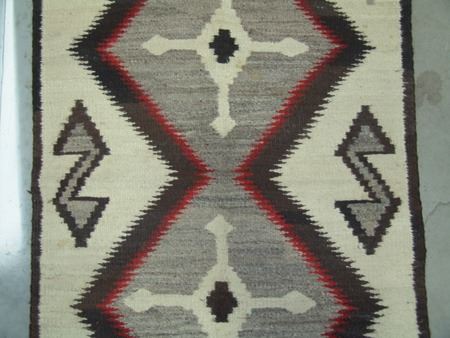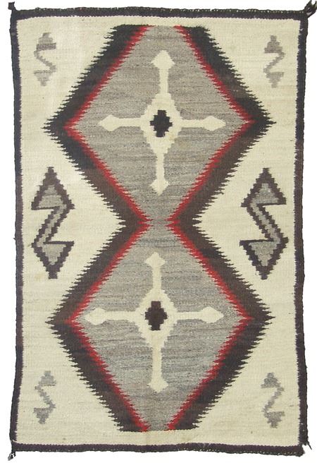 Mid 1900s, Vintage hand spun rug with Crystal-type figures and large serrated diamonds containing crosses. Good condition, has some stains. 56" x 38"