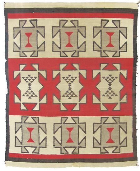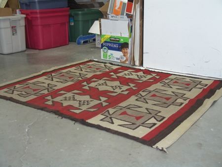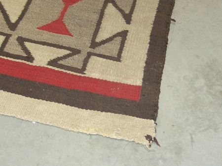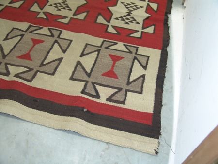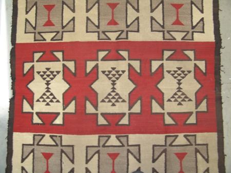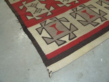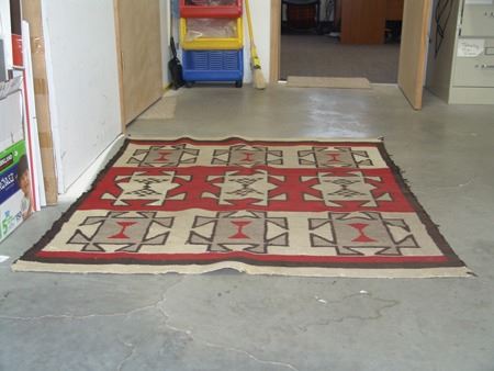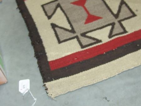Ca. 1940s, Rare vintage squarish Crystal floor rug with unique three-band geometric pattern. Fair condition, some edge and end damage. 47" x 58"