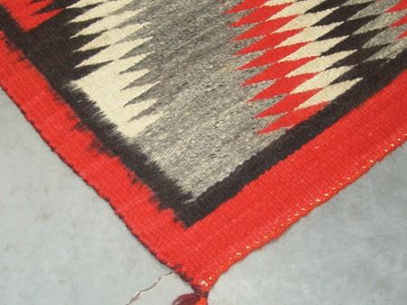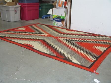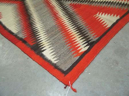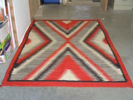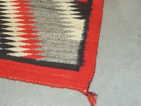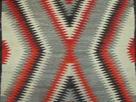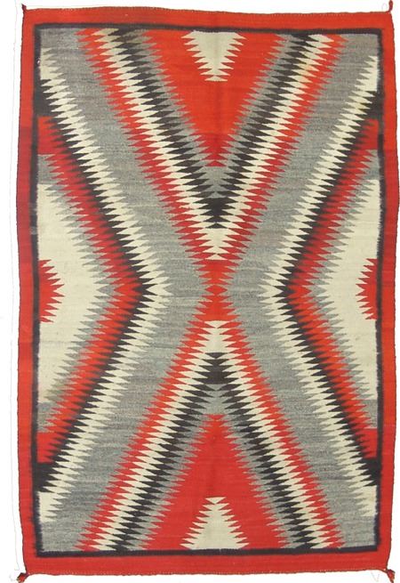 Ca. 1940s, Large homespun floor rug with striking serrated eye dazzler design. Good condition, some soiling. 77" x 50"