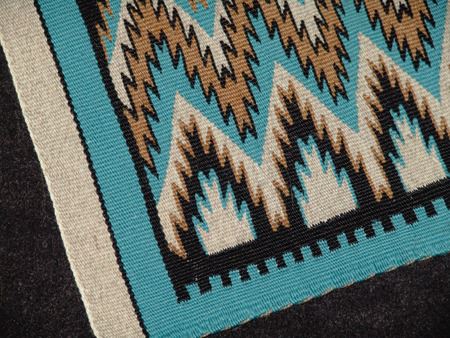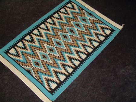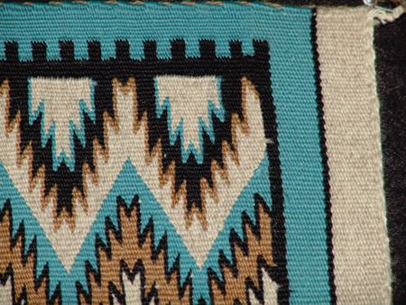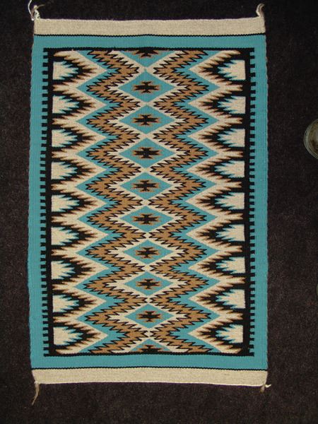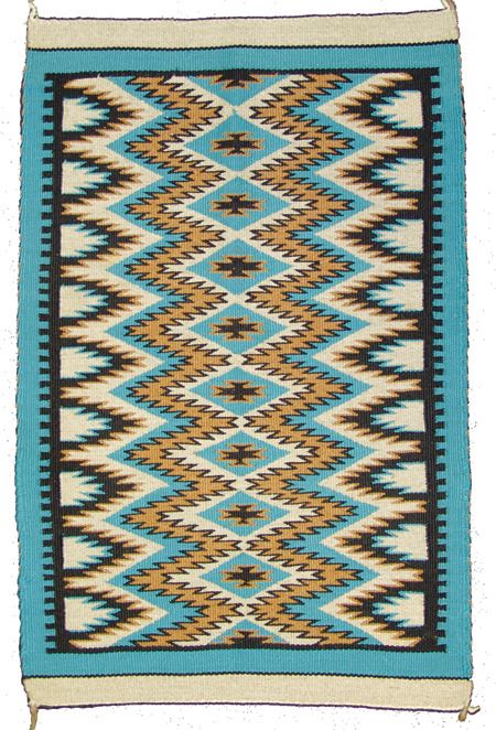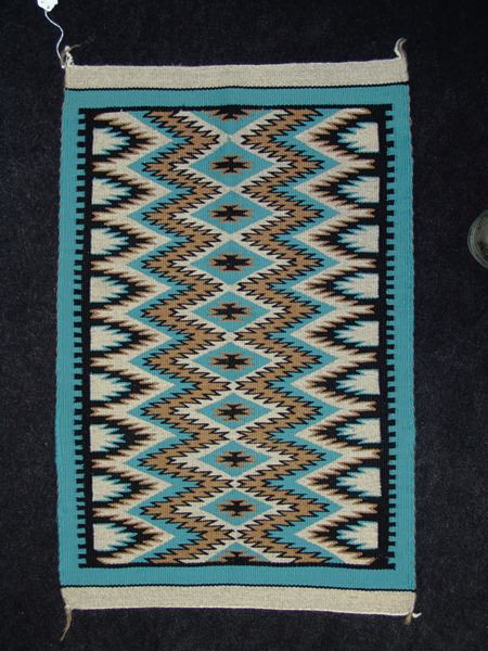 Ca. 1980, Very fine weave eye dazzler table/altar rug with finely outlined serrated designs done on a beautiful pastel field. Excellent condition. 29" x 19-1/2"