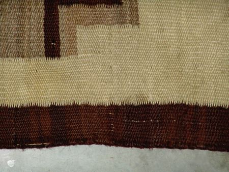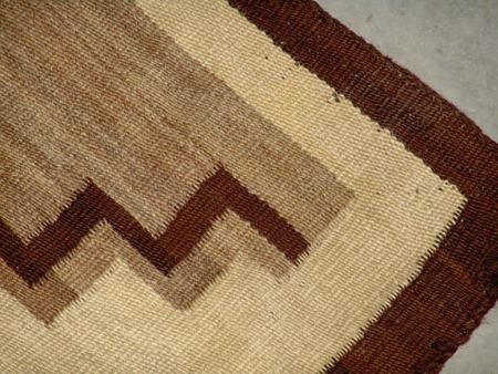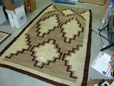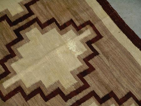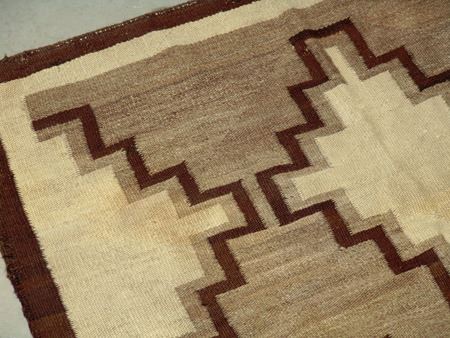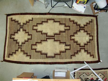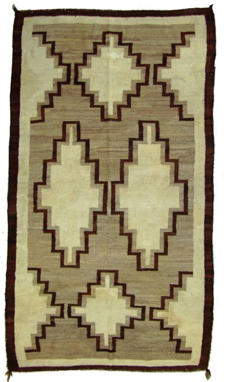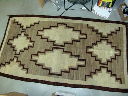 Ca. 1930s, Classic large softer eave floor rug wiht a great geometric design of stepped full and half diamonds. Fair condition with some repairs and soiling. 106" x 54"