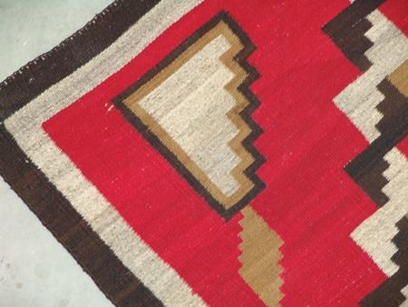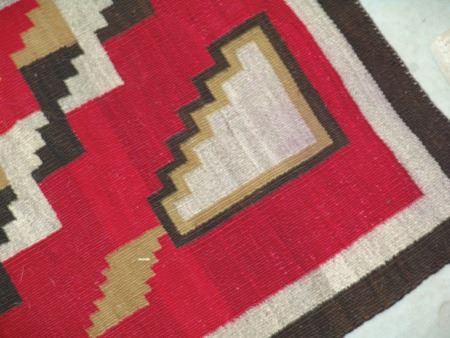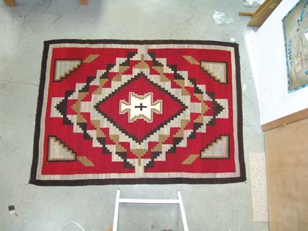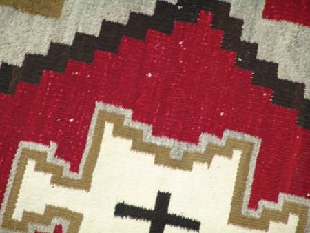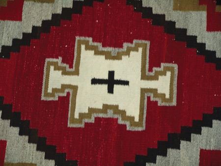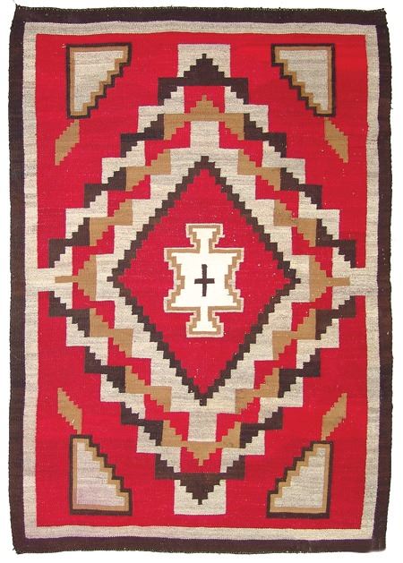 Ca. 1930s, Large colorful Ganado floor rug with interesting central form containing a cross with more traditional optical geometrics surrounding it. Good condition, great colors, has an exposed spot in the body. 72" x 52"