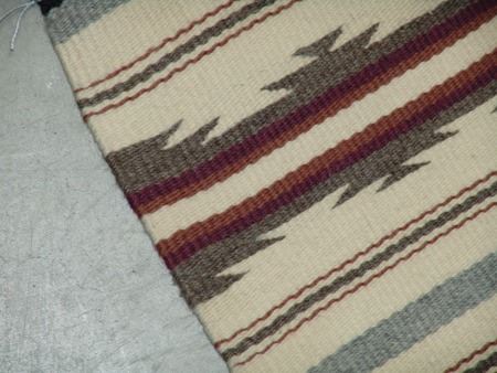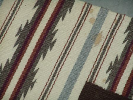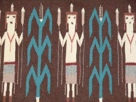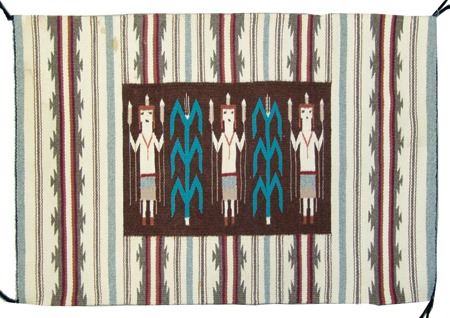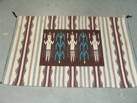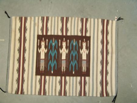 Ca. 1980s, Very fine weave Yei figured pictorial with banded Wide Ruins background. Very good condition with some small (coffee?) stains. 25" x 34"