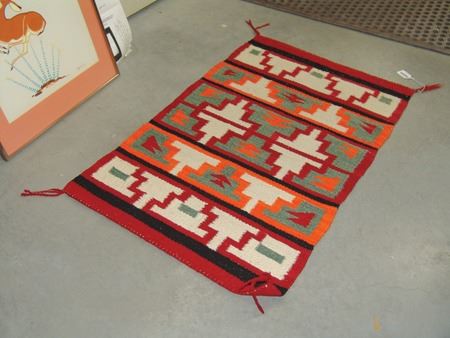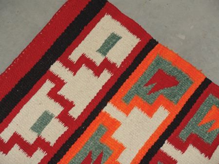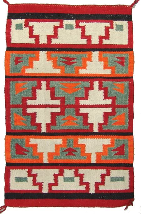 Ca. 1950s, Small colorful regional rug with interesting symbols, geometrics and block pattern. Very good condition, some minor warp exposure. 36" x 23"