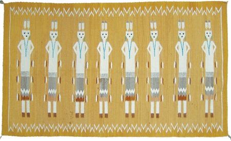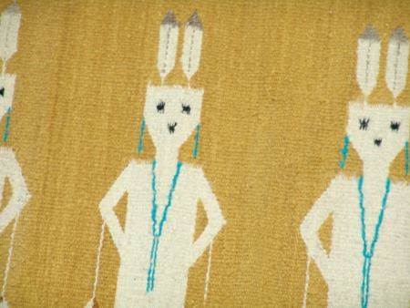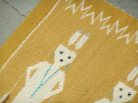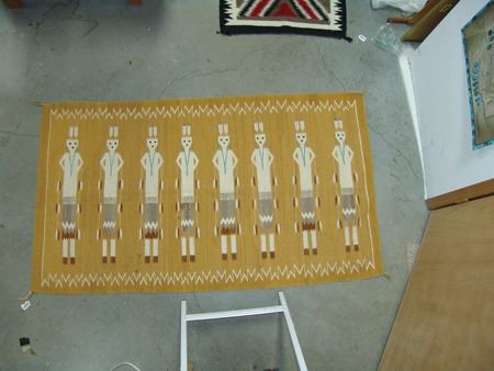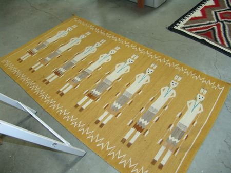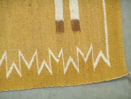 Mid 1900s, Large vintage Yei figured rug with saw tooth edges, all of sturdy home spun wool. Very good condition, minor fade on one side, minor soiling. 74" x 42"