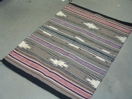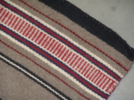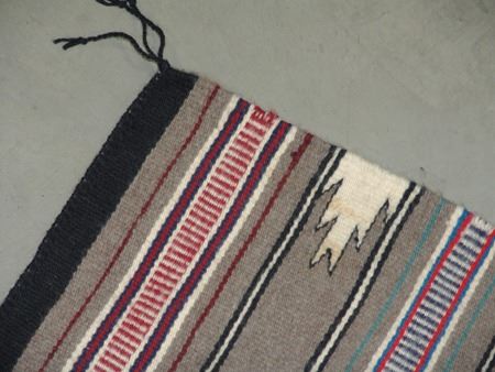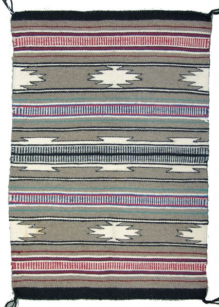 Ca. 1980s, A fine weave banded Wide Ruins rug with gray background, serrated diamond elements, and tracked bands. Very good condition. 30" x 21"