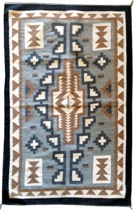 Ca. 1960s-1970s, Classic fine weave Two Gray Hills tapestry with crisp geometric elements done in beautiful earth tones. Very good condition. (A much finer rug than the poor quality photo shows.) 53" x 32"
