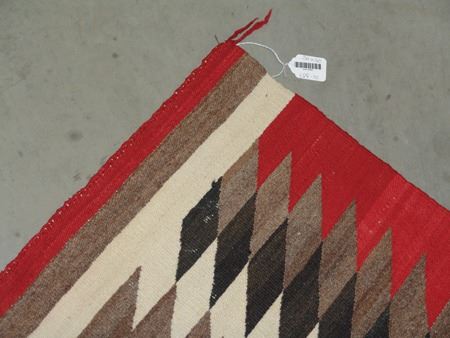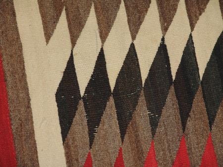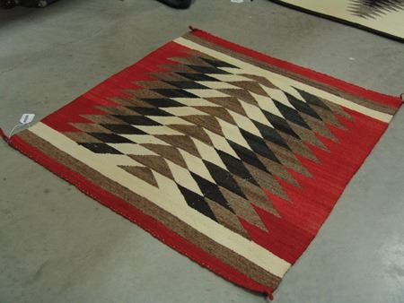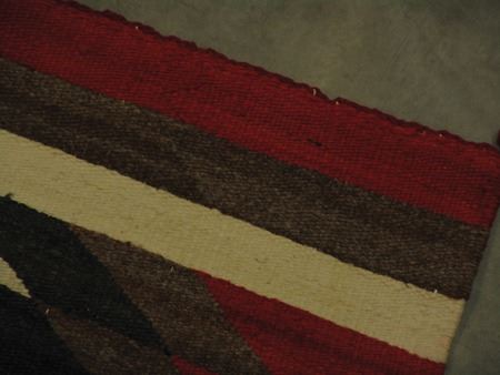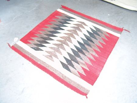 Ca. 1930s, Vintage finer weave saddle blanket in earth tones, garnet red color, and with serrated optical design. Good condition, some exposed warp, and shows some use. 32" x 30"