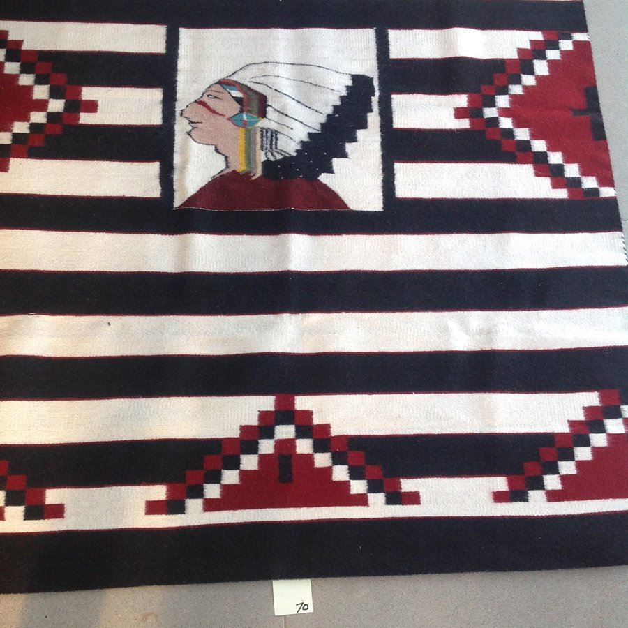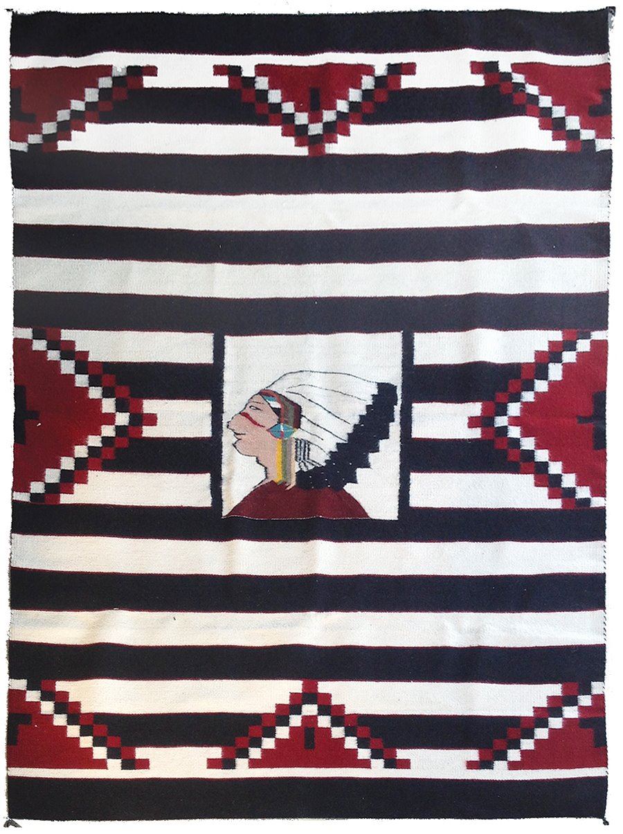 Wonderful one of a kind modified chief's blanket with traditional nine-element design except the central diamond has been replaced with a pictorial panel with a great chief's head. Very good condition.,Ca. 1980s,88" x 65"