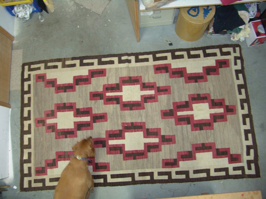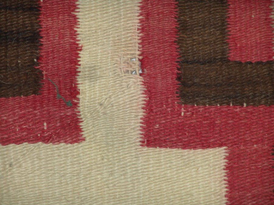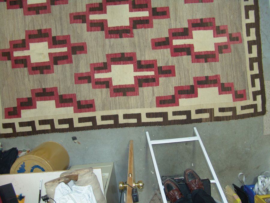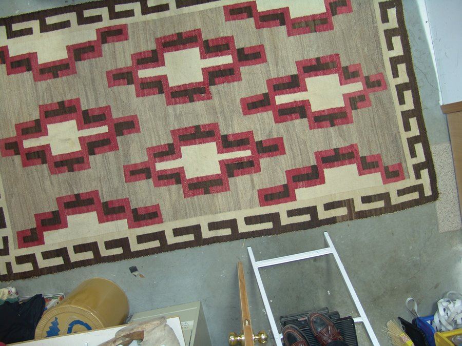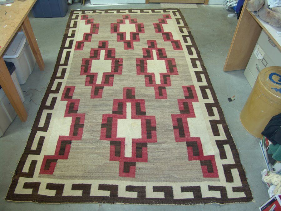 Very large, classic regional floor rug with optical elements done in red, tan (white), brown, and heather. Fair condition. Intact with some exposed warp, areas of wear and some soiling.,,116" x 67"