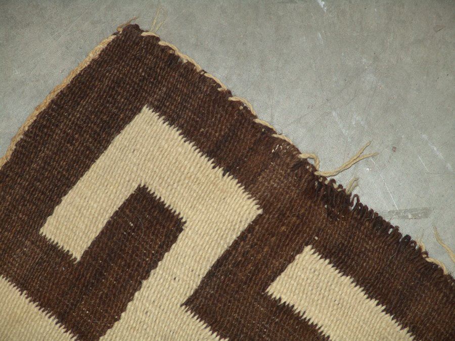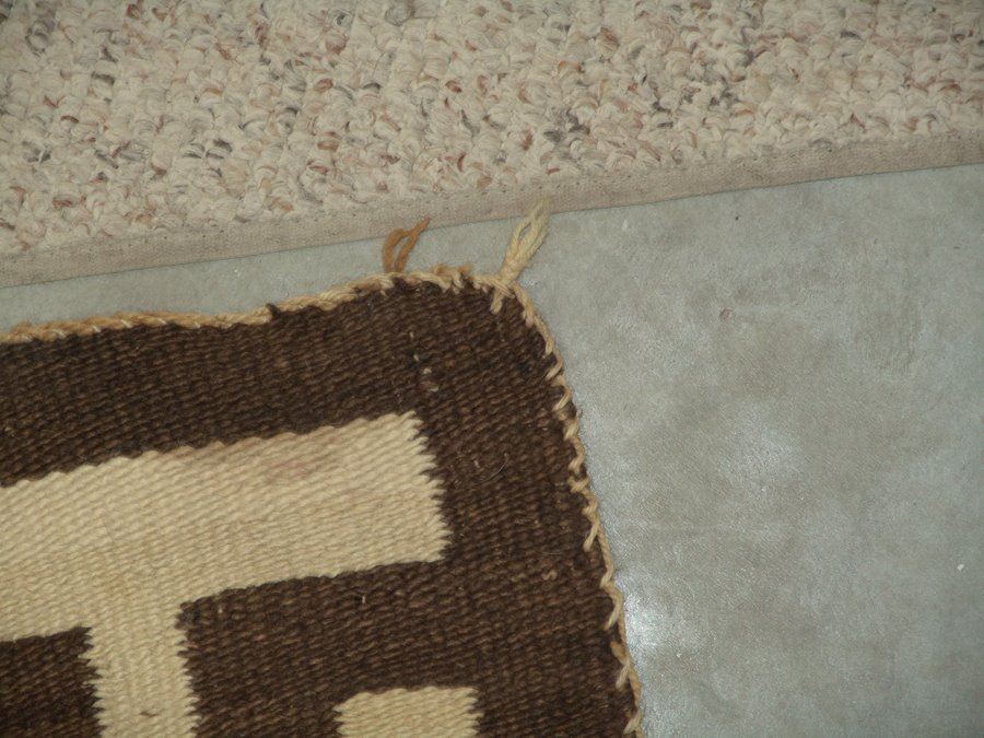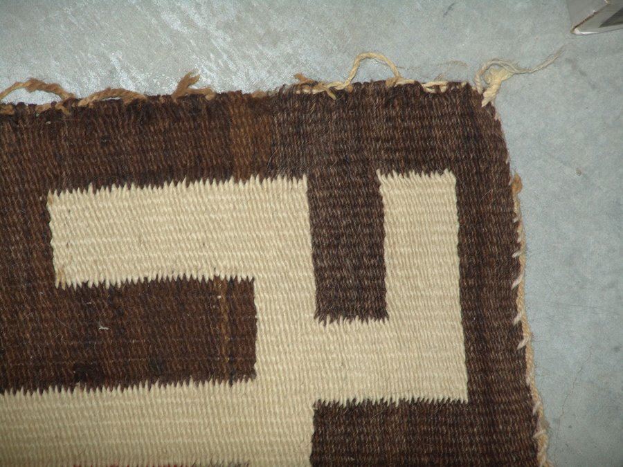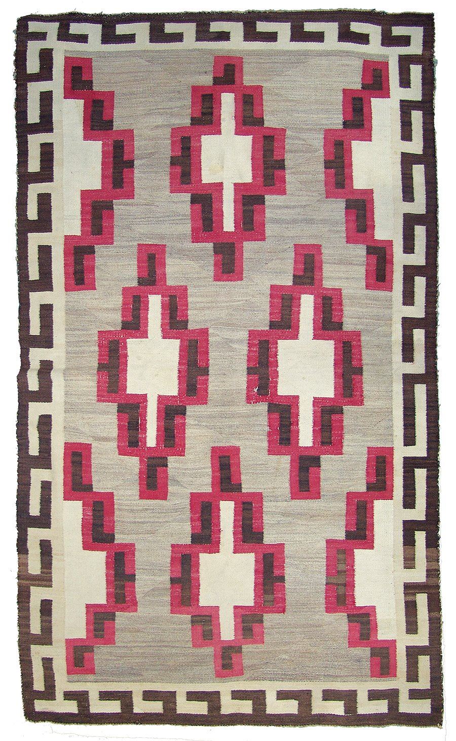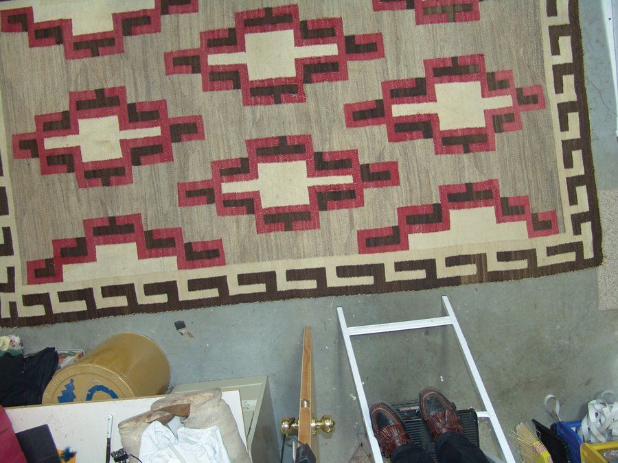 Very large, classic regional floor rug with optical elements done in red, tan (white), brown, and heather. Fair condition. Intact with some exposed warp, areas of wear and some soiling.,,116" x 67"