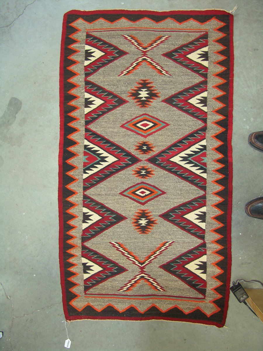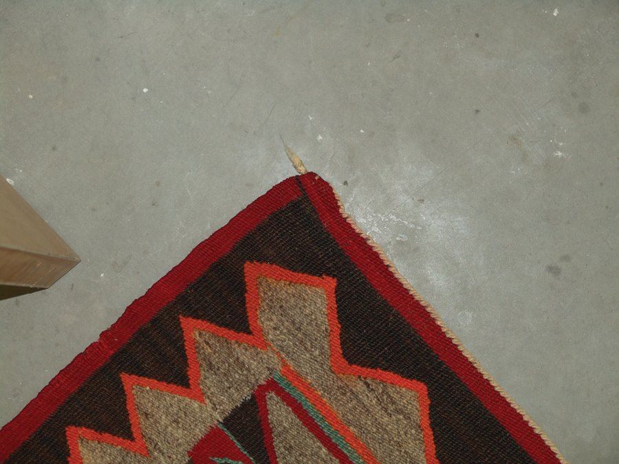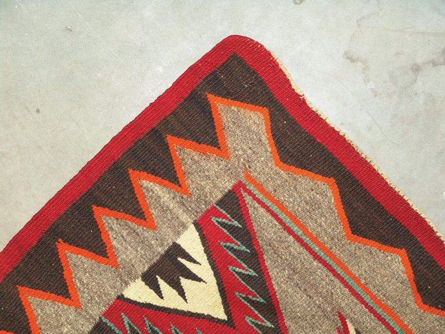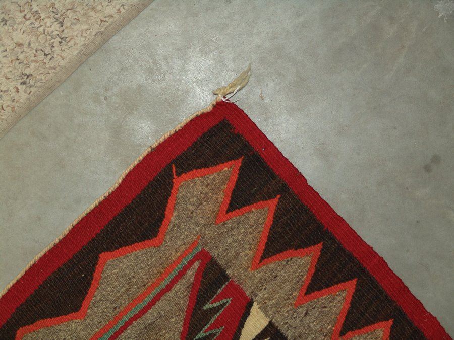 Classic, finer weave Red Mesa floor rug with saw tooth border and fine, outlined serrated devices. Very good condition, great color.,,60" x 32"