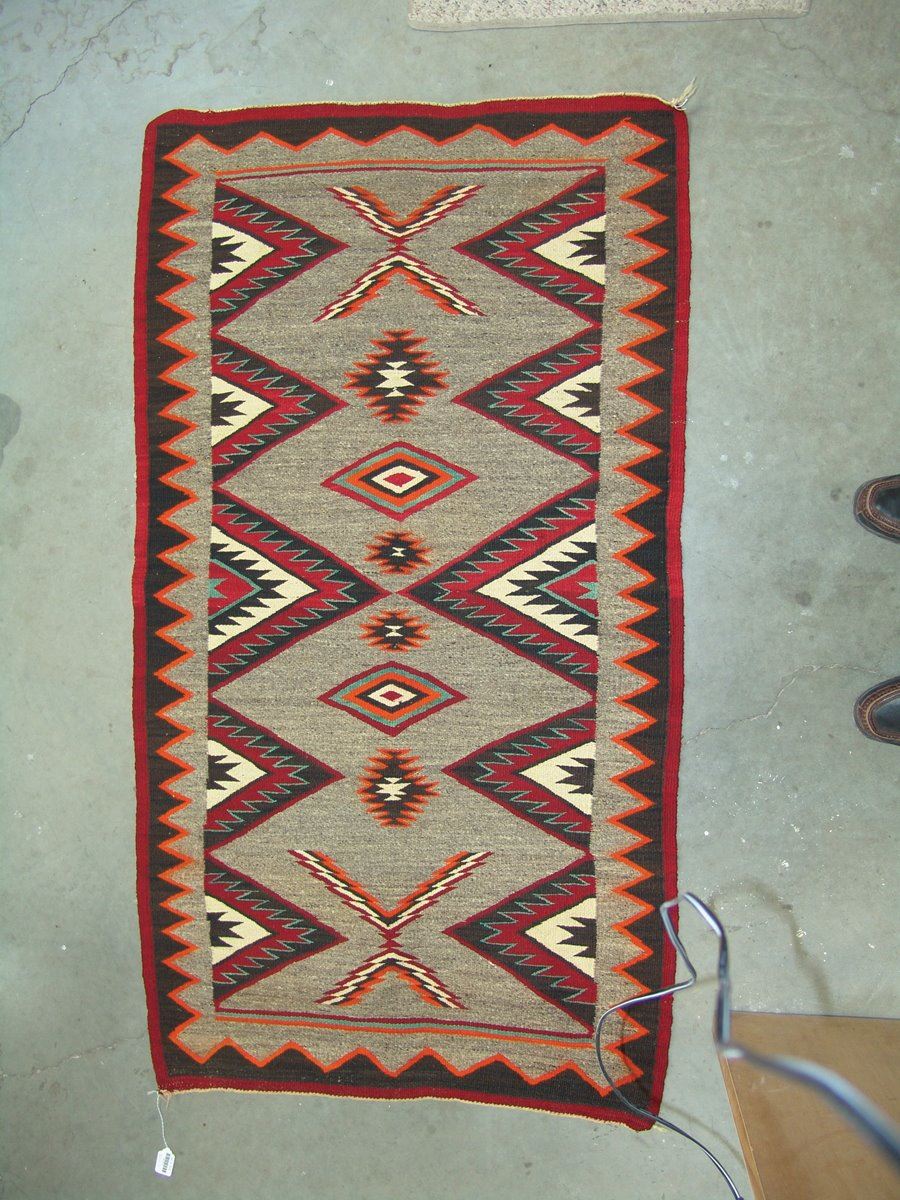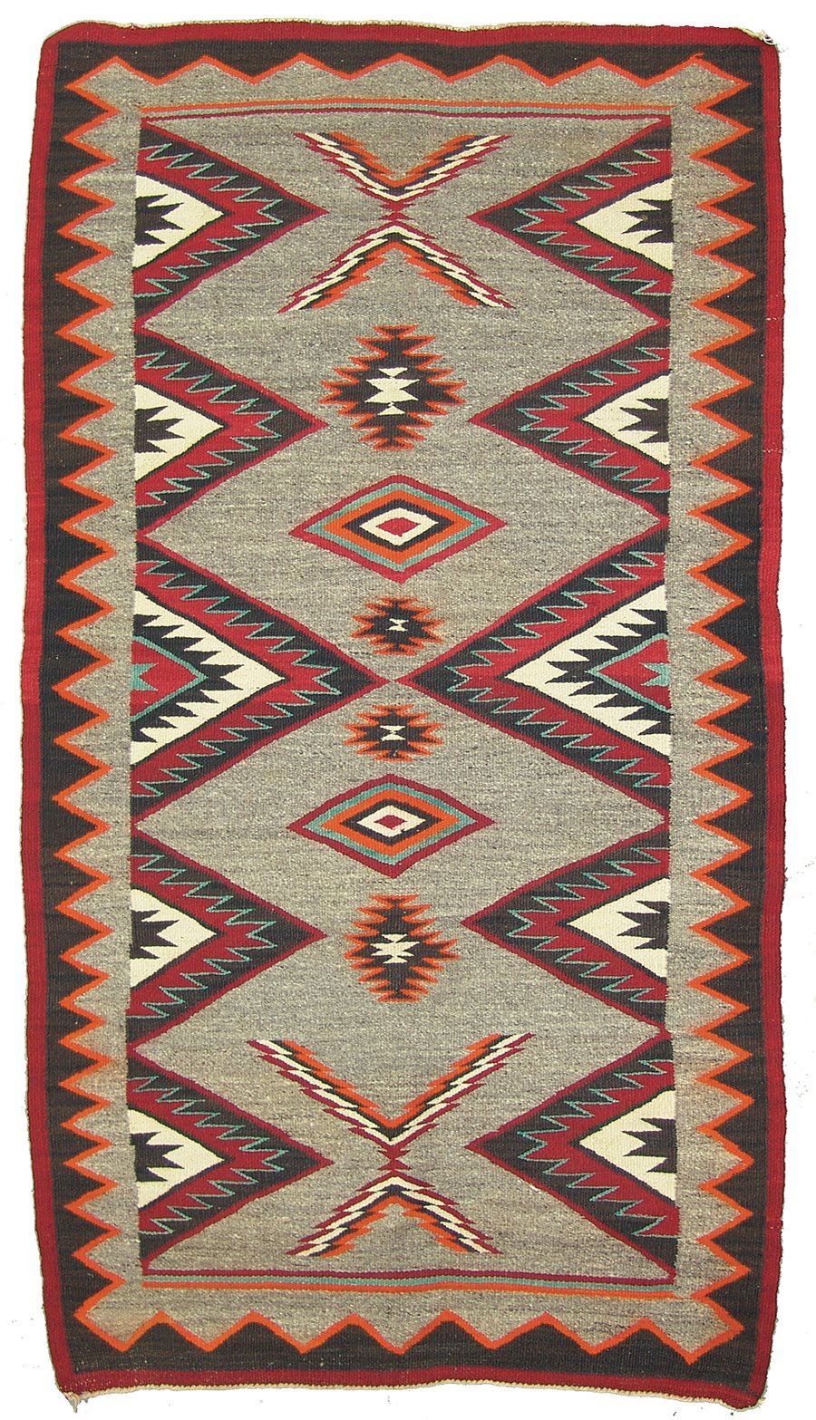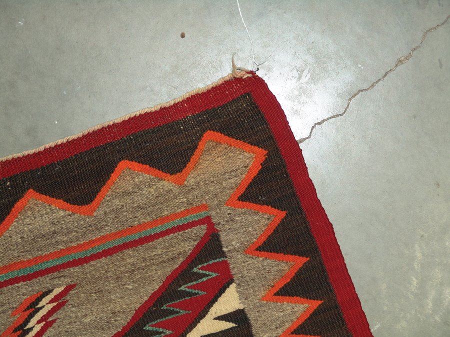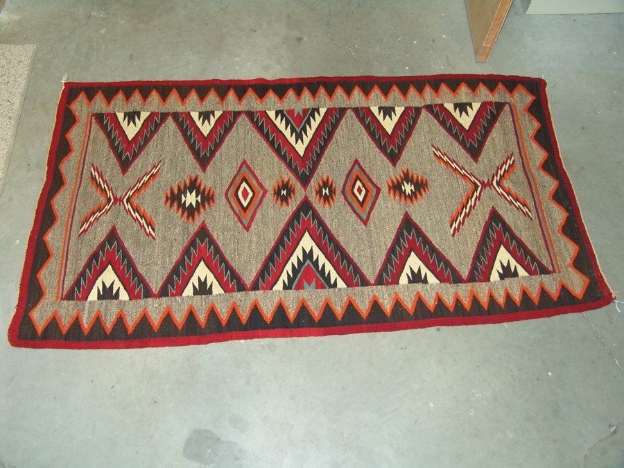 Classic, finer weave Red Mesa floor rug with saw tooth border and fine, outlined serrated devices. Very good condition, great color.,,60" x 32"