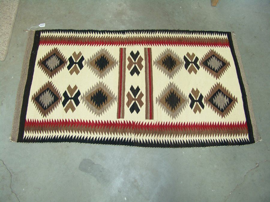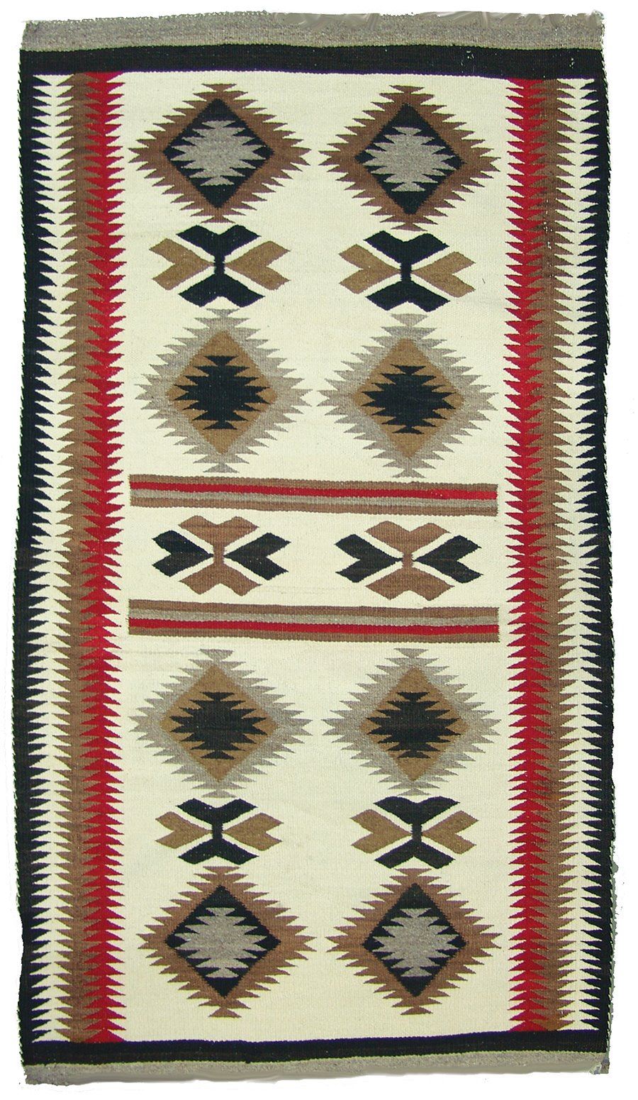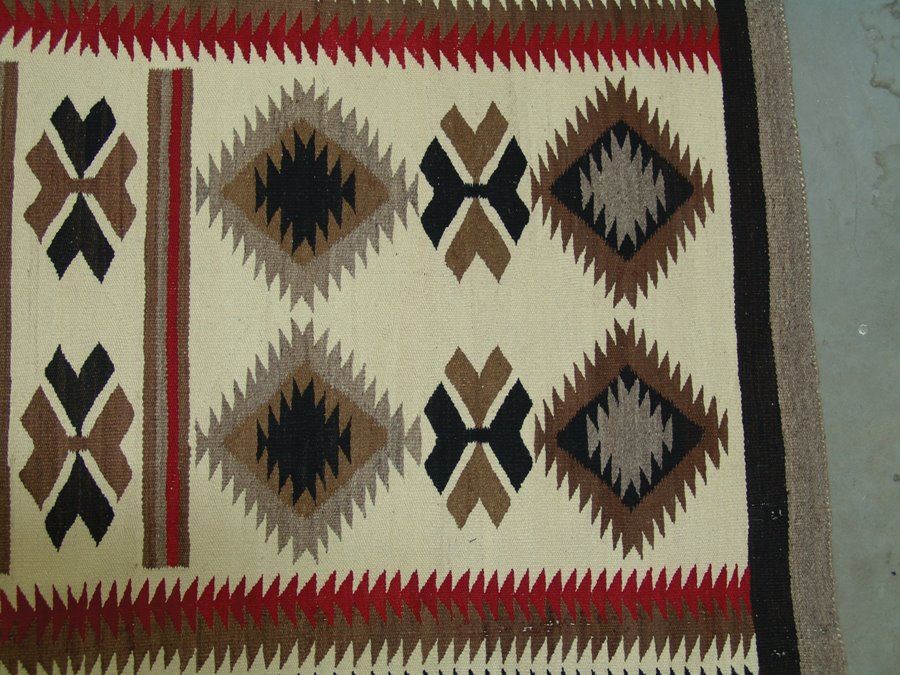 Clean and crisp, tight weave eye dazzler with serrated elements and unusual figures, and with wonderful serrated edges/border. Very good condition.,,57" x 31"