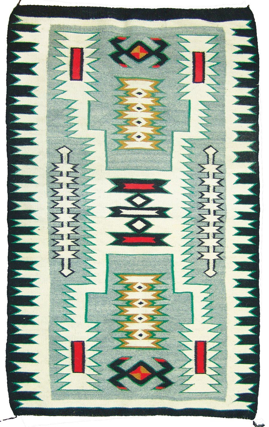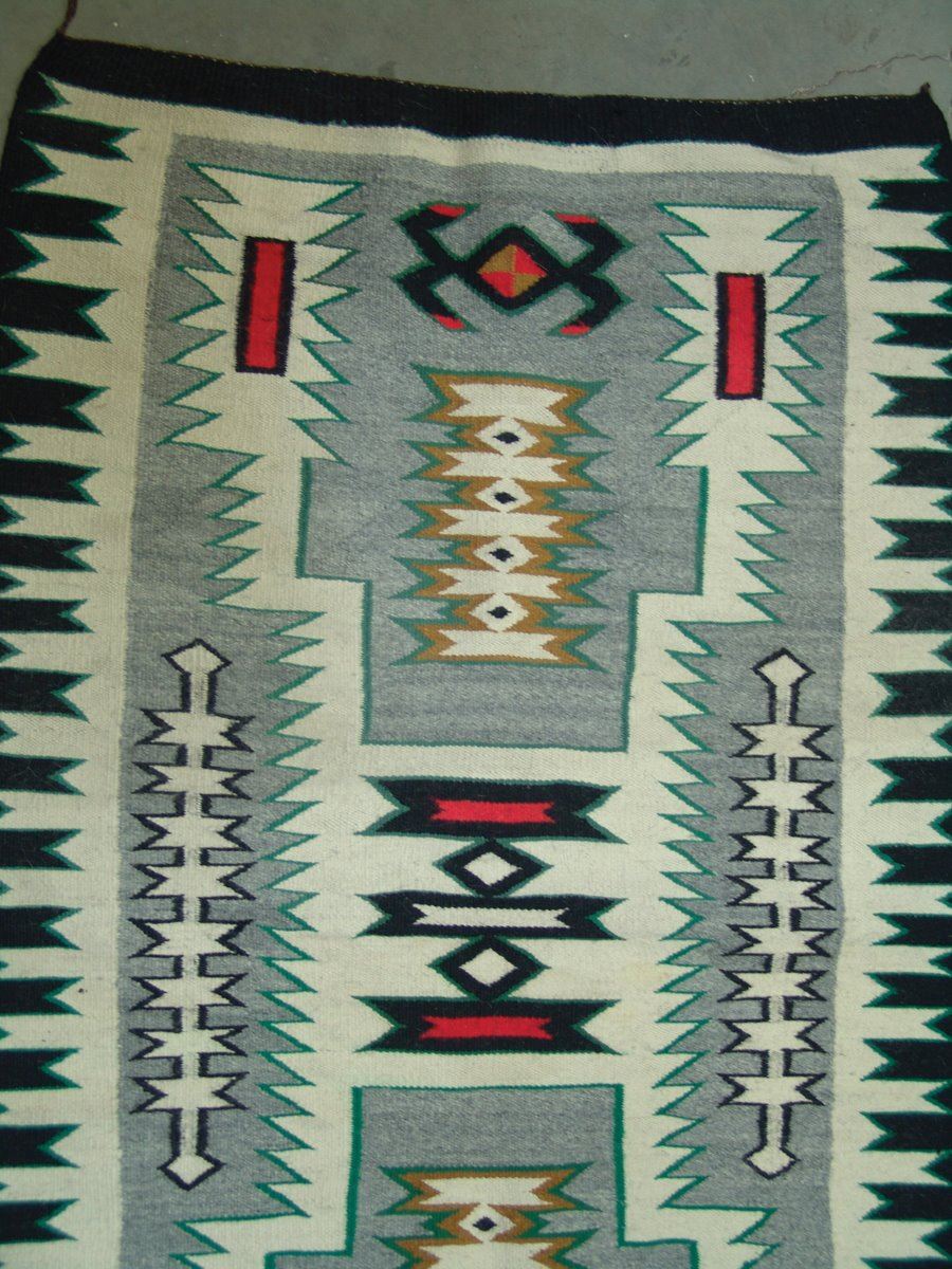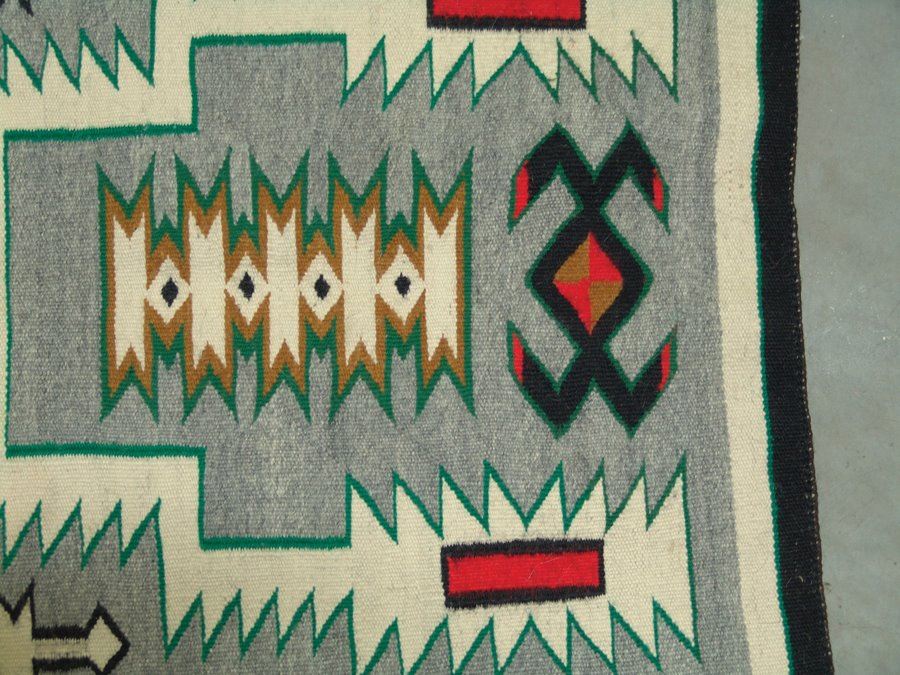 Vintage, finer weave Storm Pattern rug with exciting geometric forms done in traditional colors, and with unique gold and green accents. Very good condition.,,52" x 32"