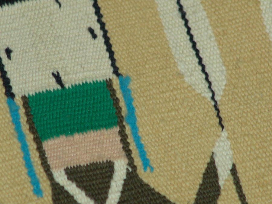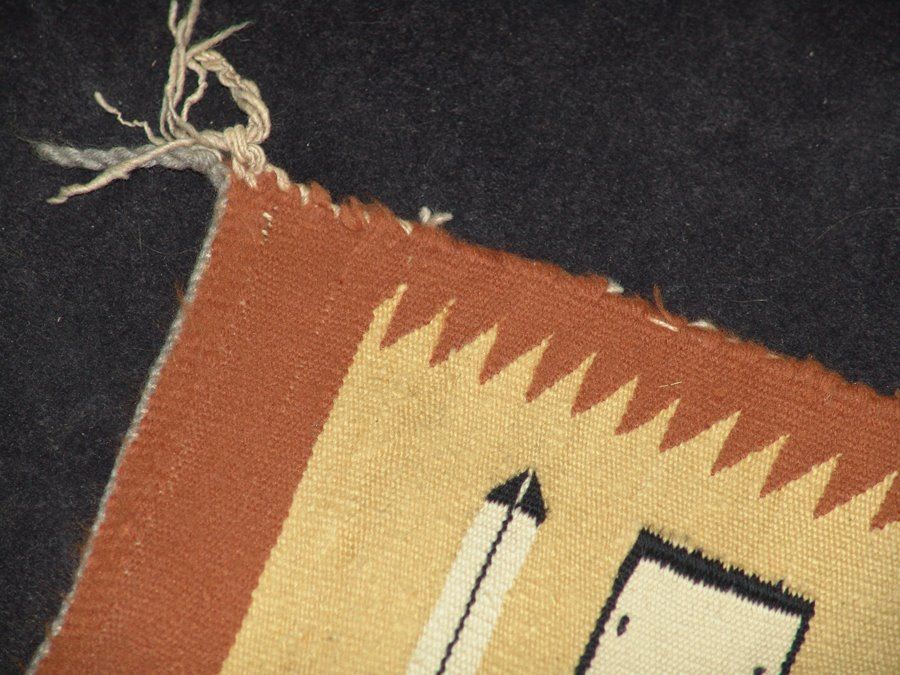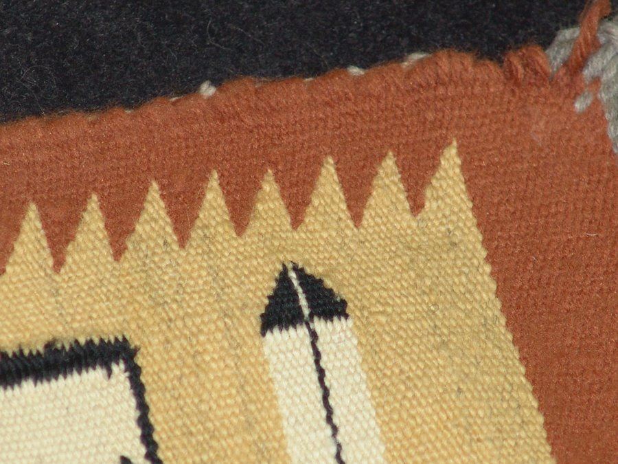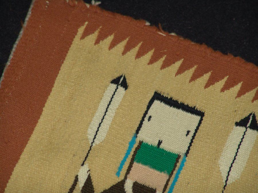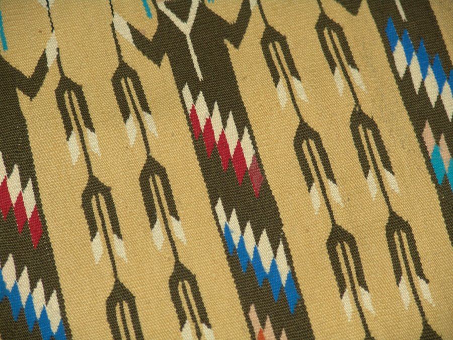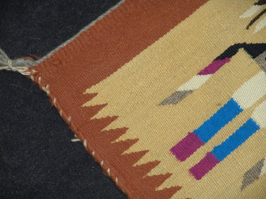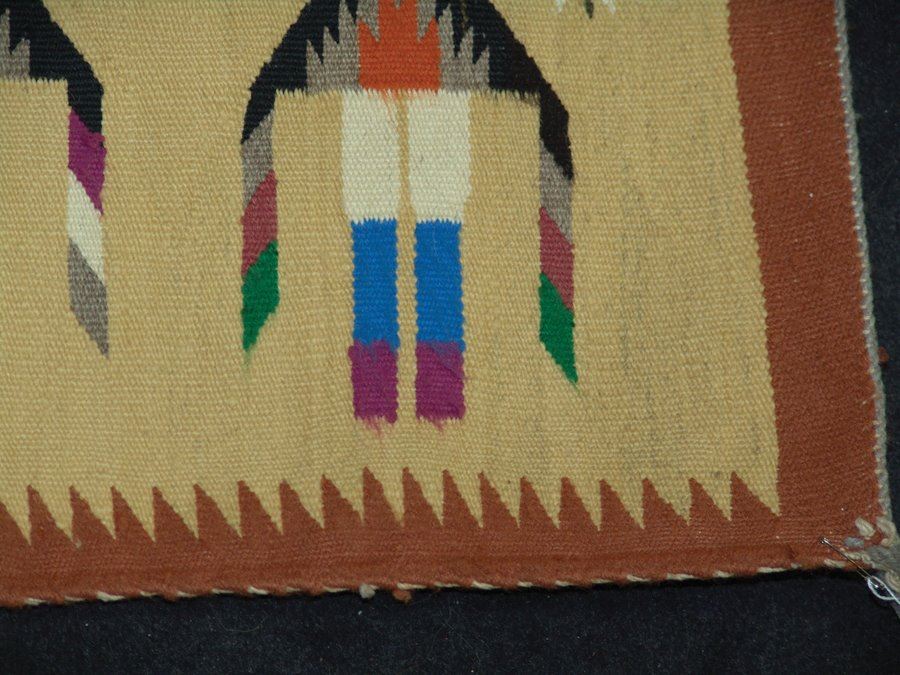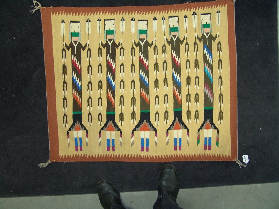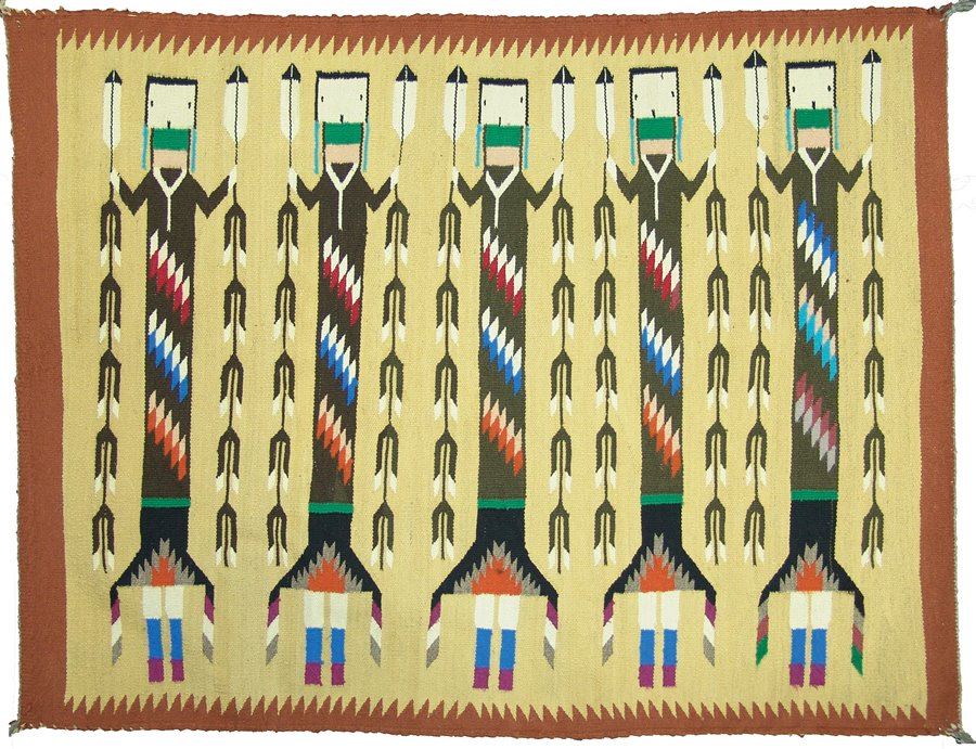 Colorful, fine weave Yei figured rug the five deities all with corn stock and feather staffs, the bodies with unique rows if serrated elements. Very good condition. Minor edge erosion.,,40" x 33"