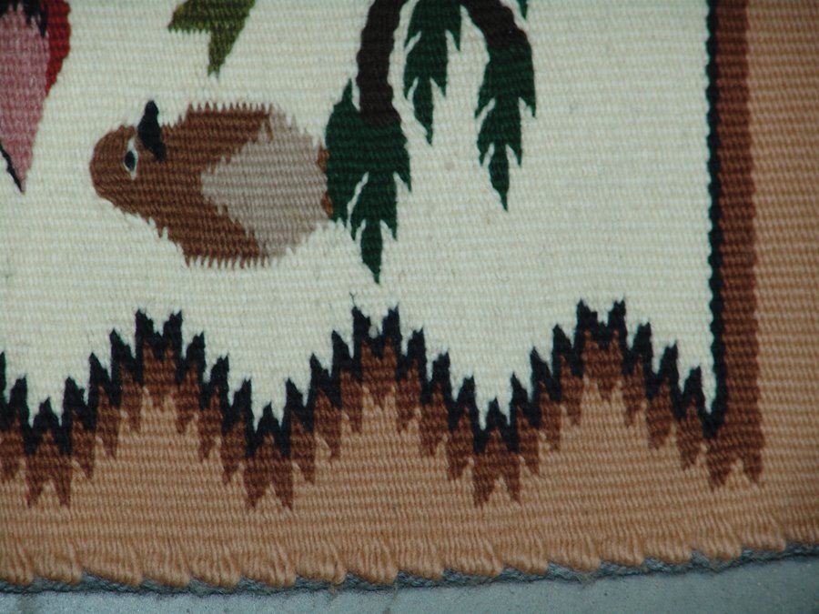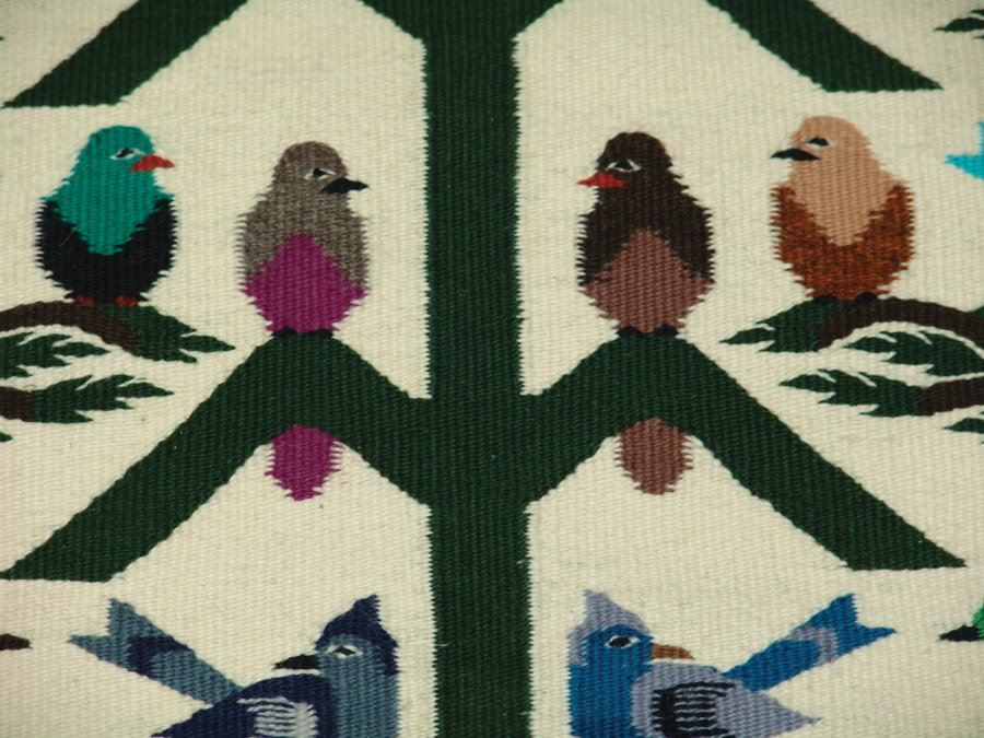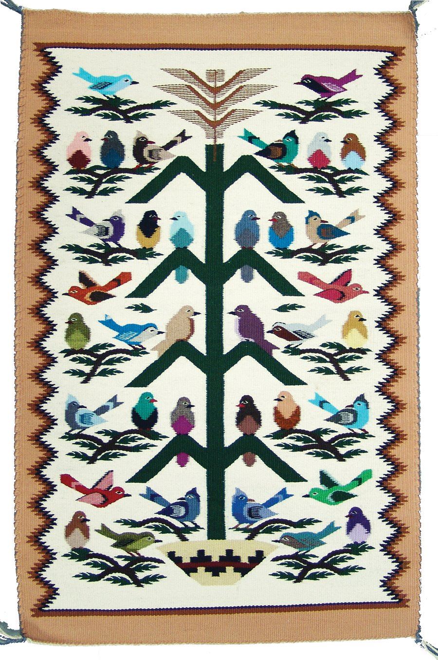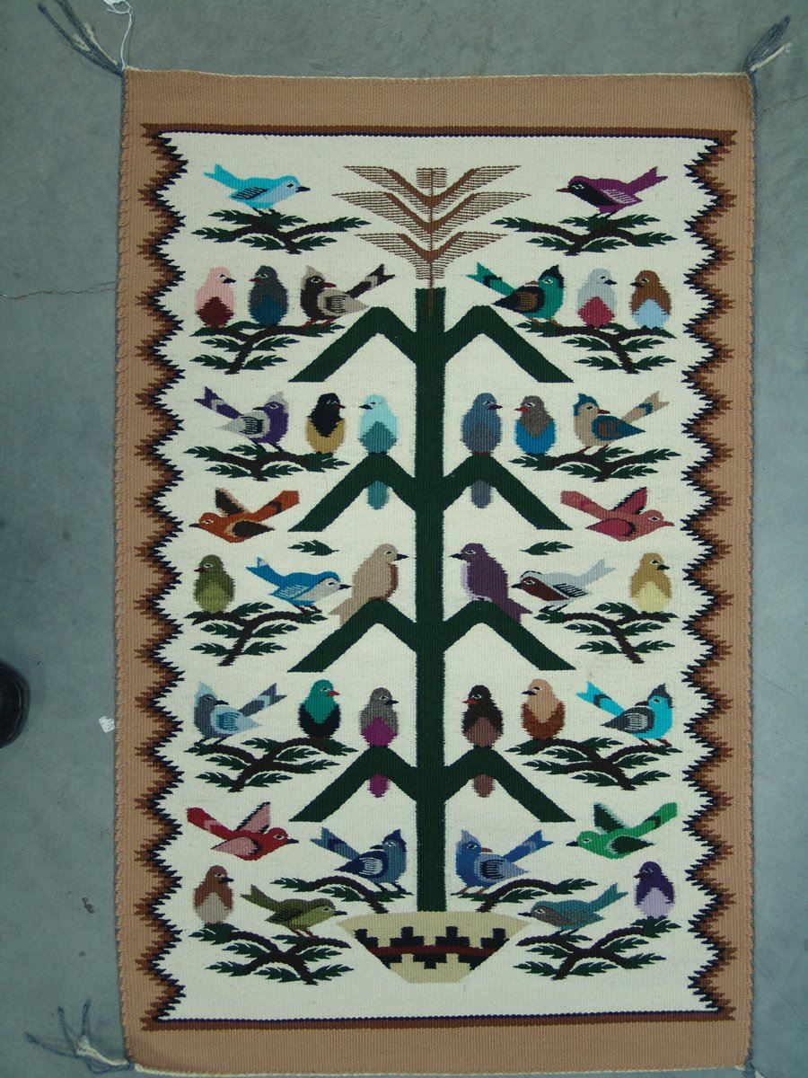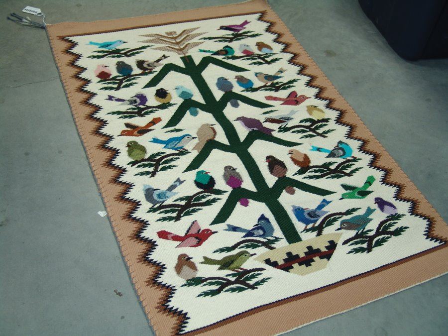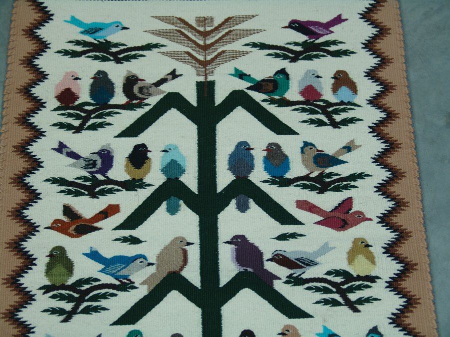 Heavier, fine weave tree of life rug loaded with colorful bird figures, and with three colors, serrated outline. Very good condition.,,35" x 23"
