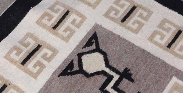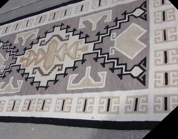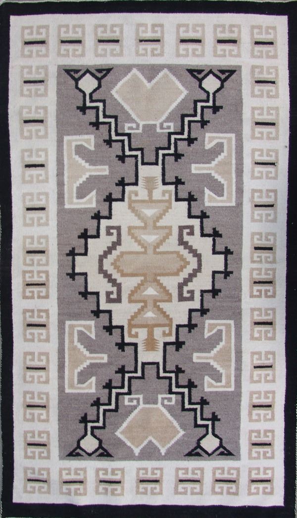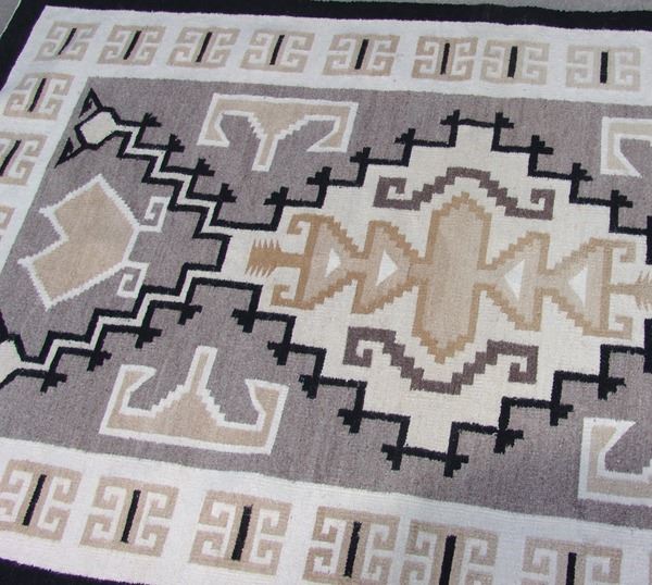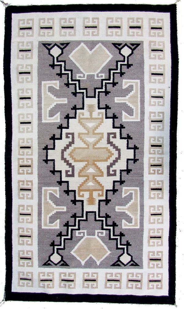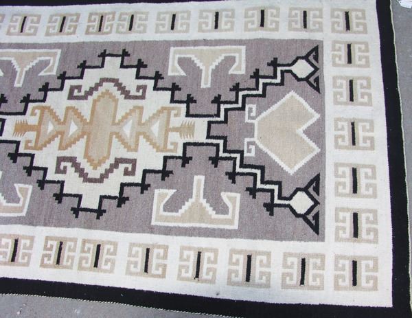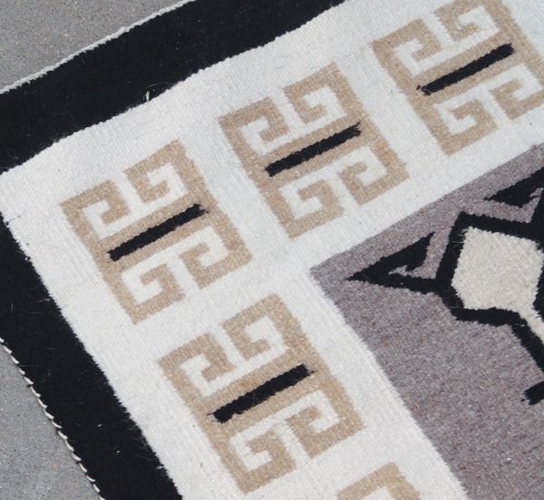 Wonderful, vintage Two Grey Hills rug with traditional geometric pattern including hooks, done in natural earth tone colors. Good condition, shows some wear.Mid 1900s74" x 42"