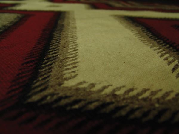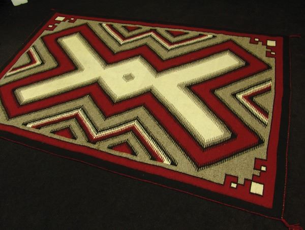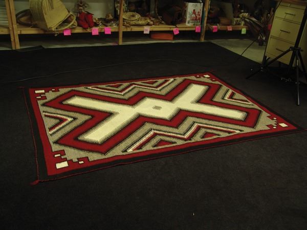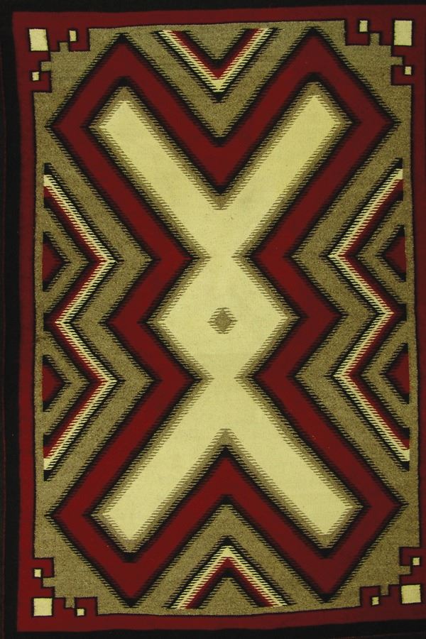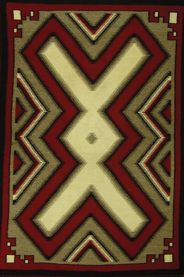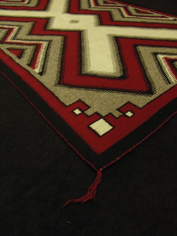 Very fine weave Klagetoh rug with tracked geometric design done using deep, garnet red woods. Very good condition.Ca. 1980s68" x 46"