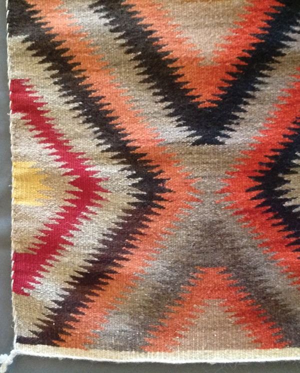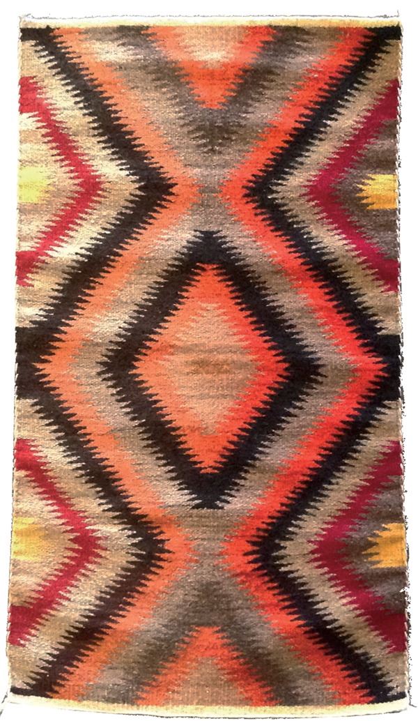 Colorful, homespun eye-dazzler rug with serrated elements. Good condition.Mid 1900s39" x 20"