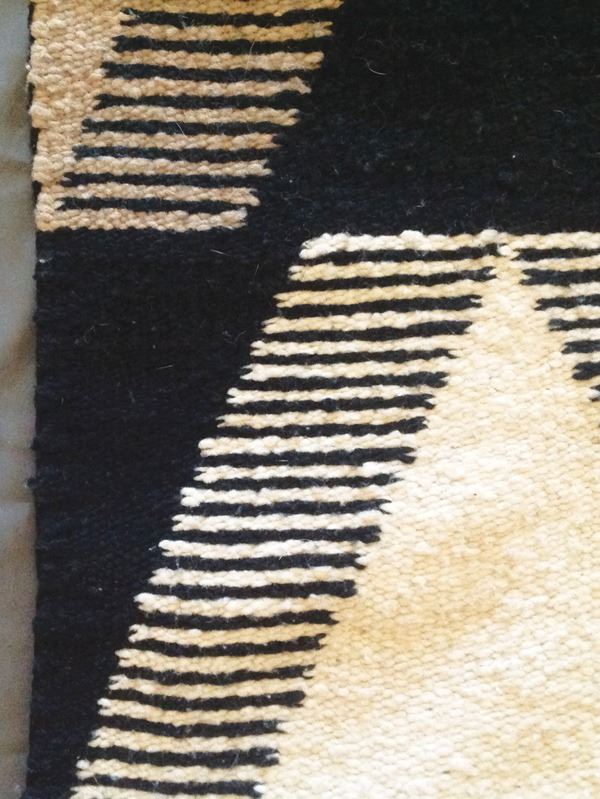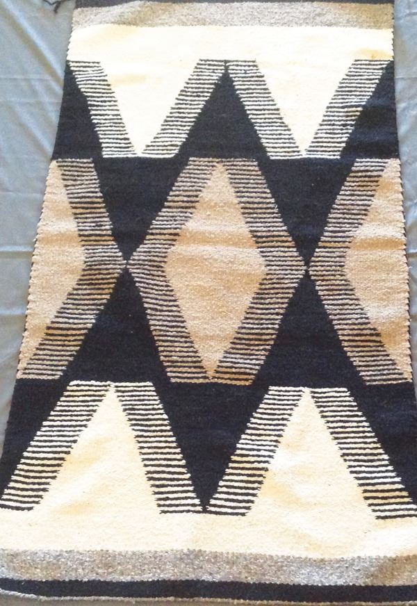 Traditional, homespun rug with tracked, optical elements. Very good condition.Ca. 1970s56" x 31"