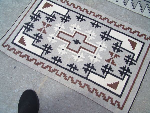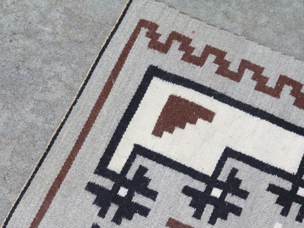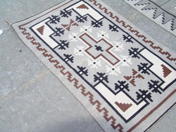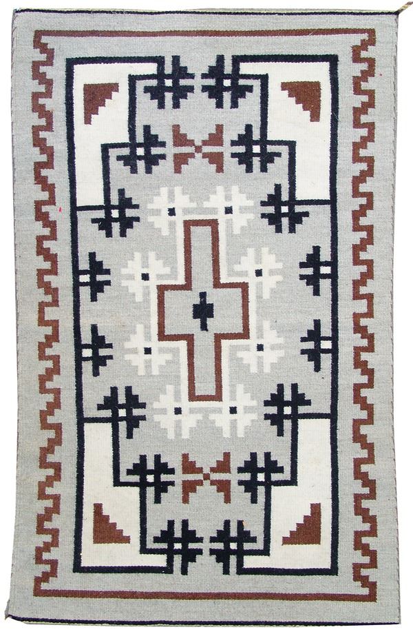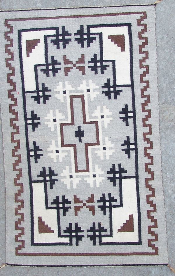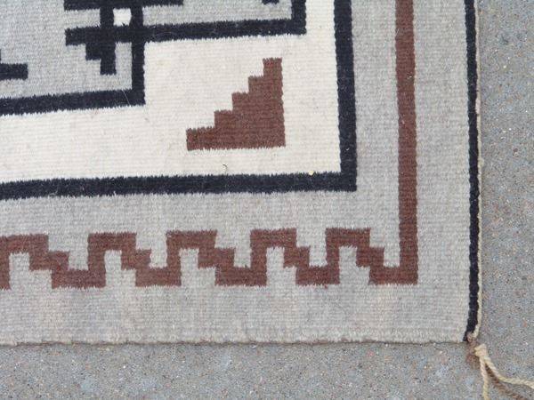 Very fine weave Toadlena/Two Grey Hills rug done in natural earth tone colors in traditional, geometric pattern. Very good condition.Ca. 1980s36" x 22"
