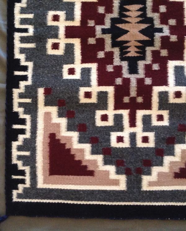 Beautiful, finer weave Klagetoh tapestry with crisp geometric designs. Very good condition, small stain.Ca. 1980s34" x 23"