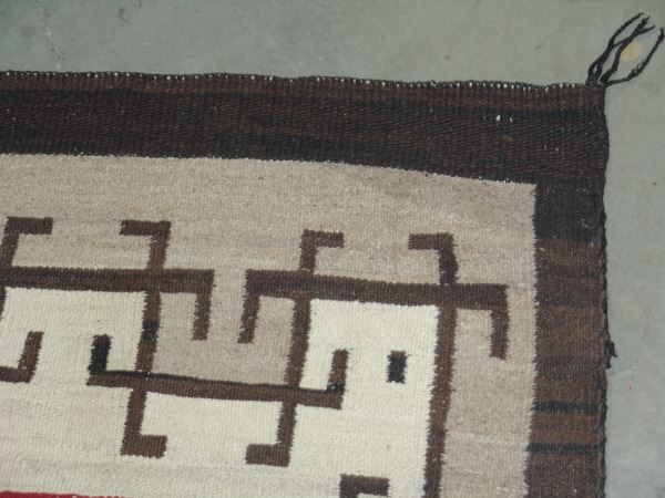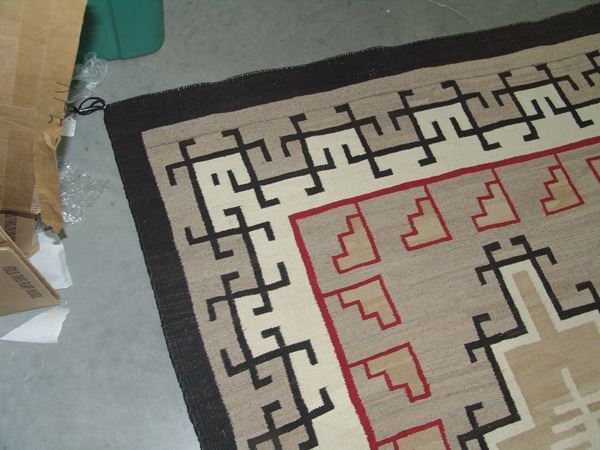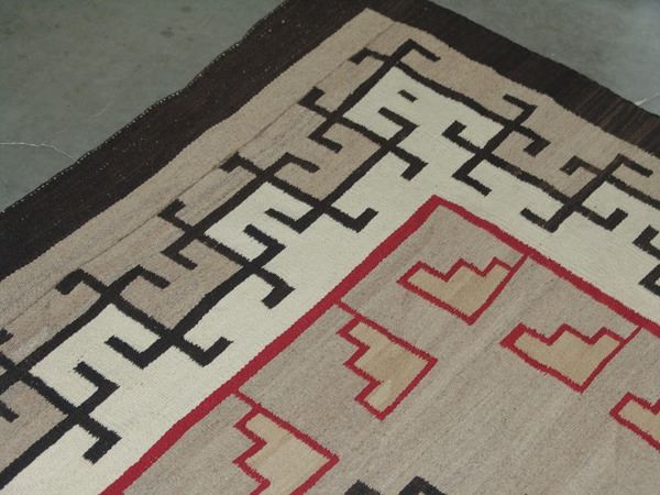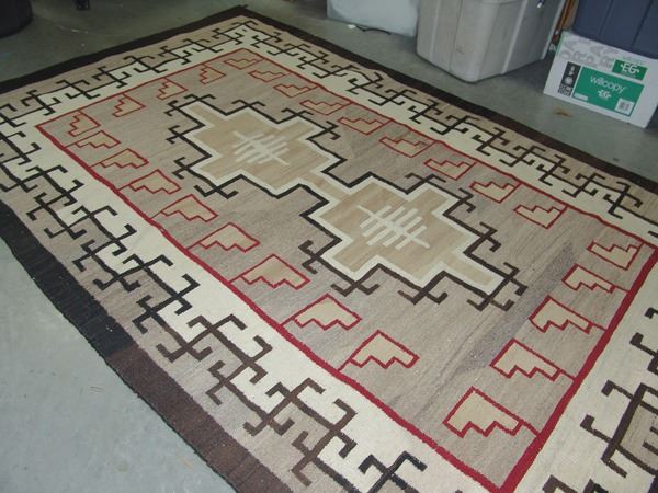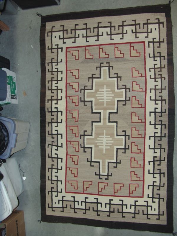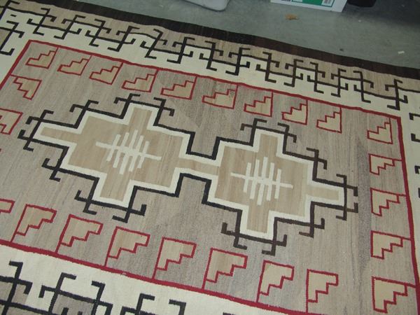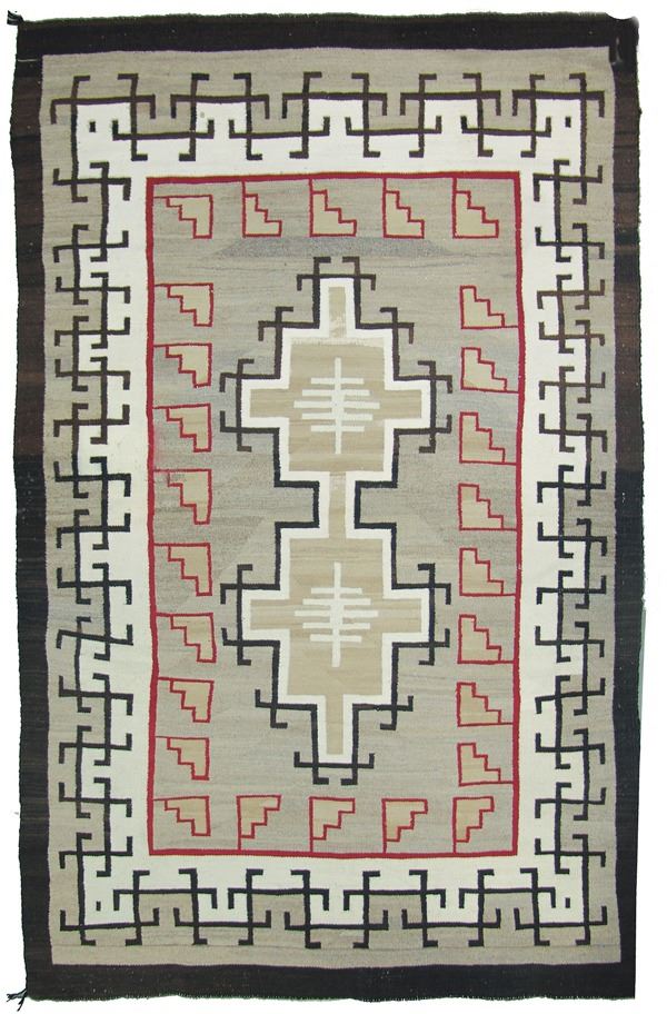 Ca. 1930s 55" x 90" Large, classic, Crystal rug with double central lozenges, bug figures, and loaded with hook shapes. Very good condition. Great color and patina.