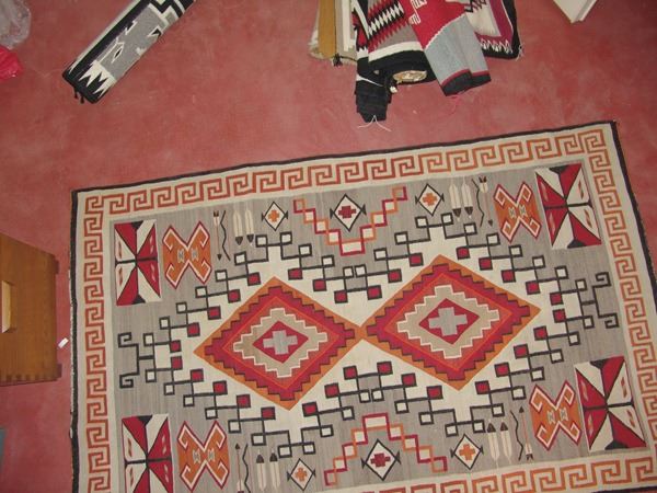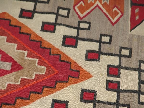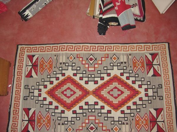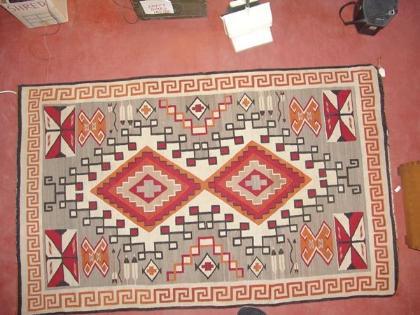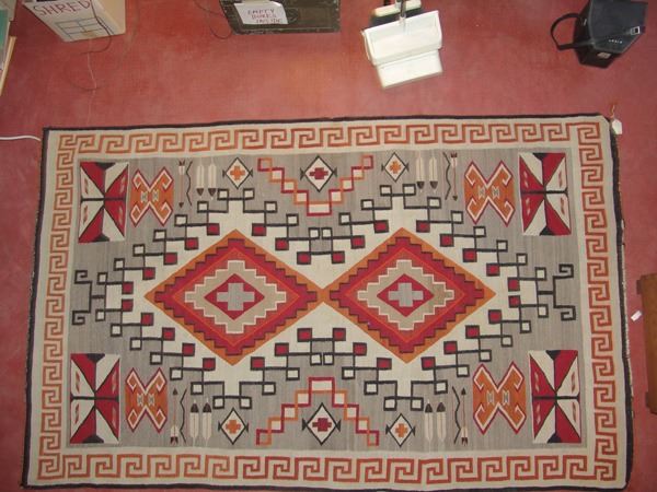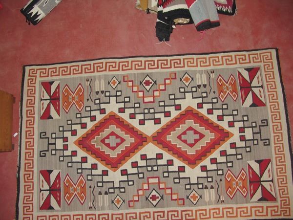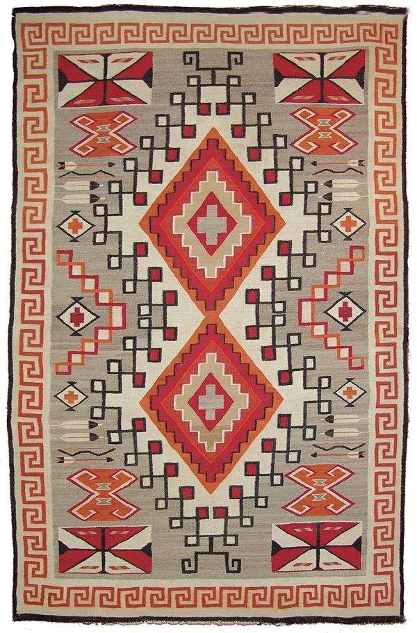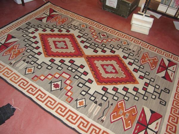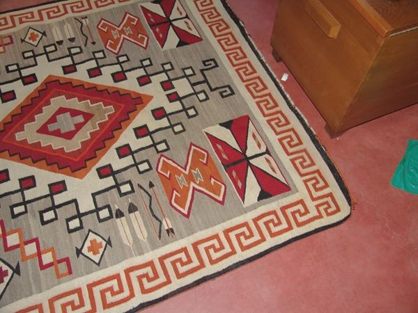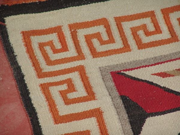 Outstanding, Teec Nos Pos rug full of colorful geometrics plus feathers, bows and arrows, crosses, fishhooks, and more all surrounded by a key design border. Very good condition, some edge erosion, one small hole.