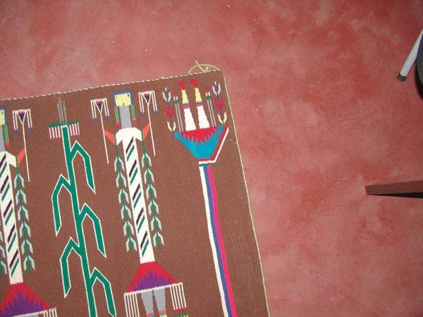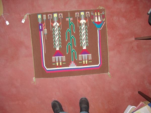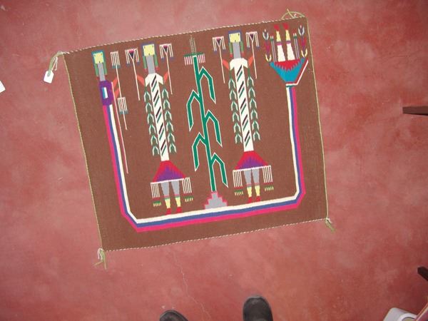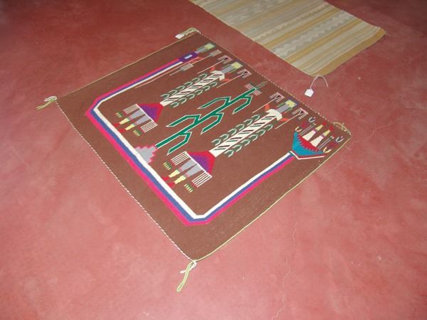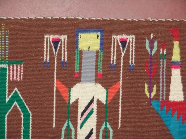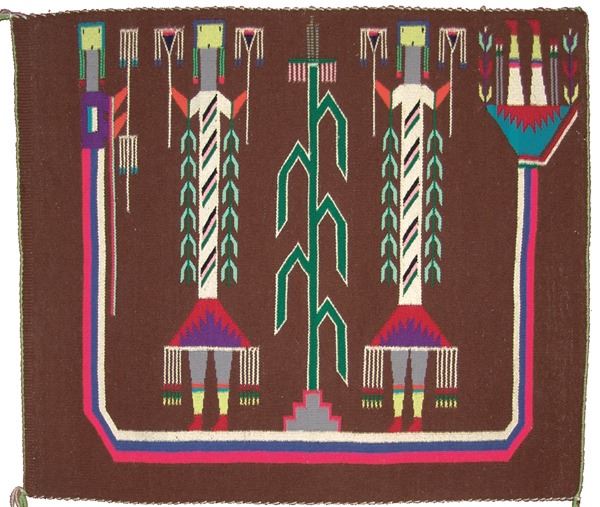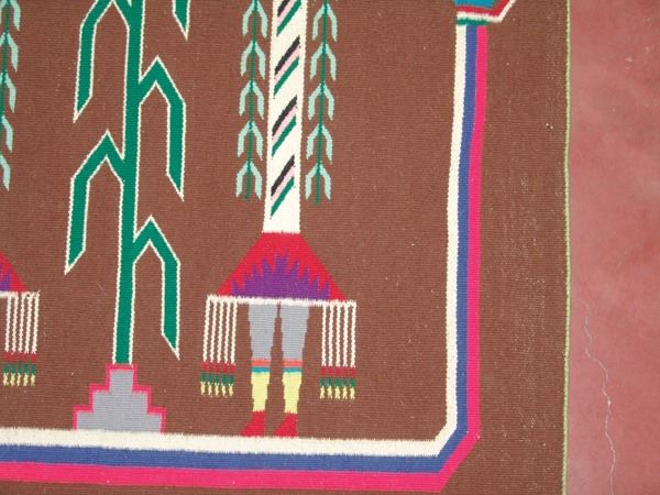 Ca. 1980s 29" x 34" Unique, Yei figured tapestry done with fluorescent and bright colors on a dark brown background. Very good condition.