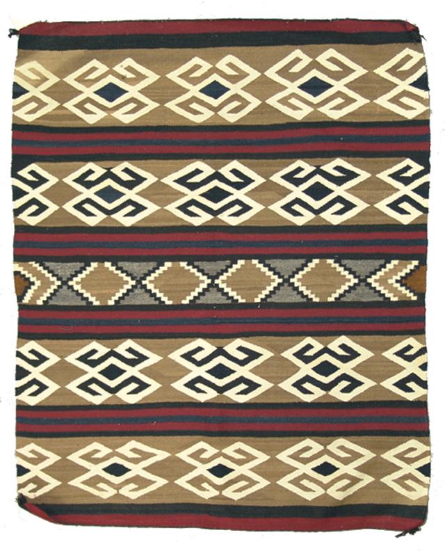 Early/Mid 1900s, Beautiful Chinle/Crystal rug with rare black, red, and blue chief's stripes and intricate fishhook design; very good condition. 58" x 48"