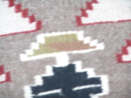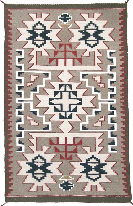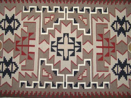 Very fine weave modified storm pattern rug with intricate terraced geometric designs and crisp brown border. Condition: very good. 50" x 30"
