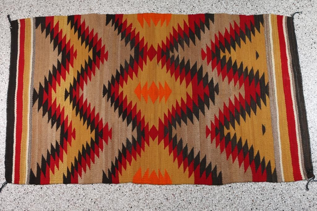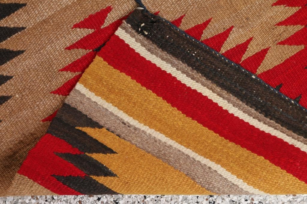 With striped corners. Measures 61 1/2" x 36". Condition is good, shows some small holes and minor edge wear.