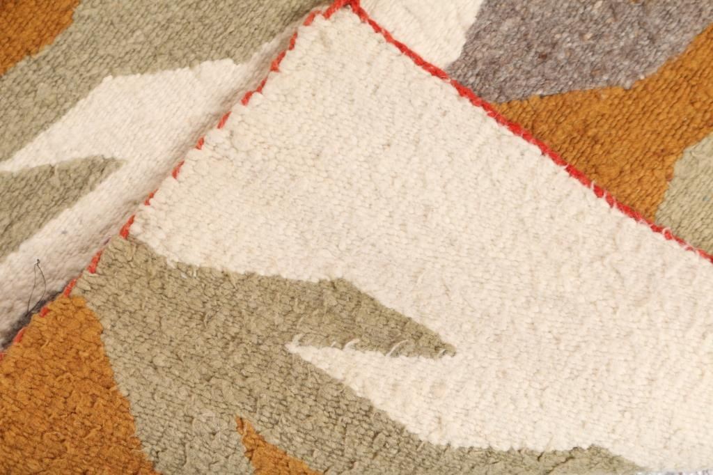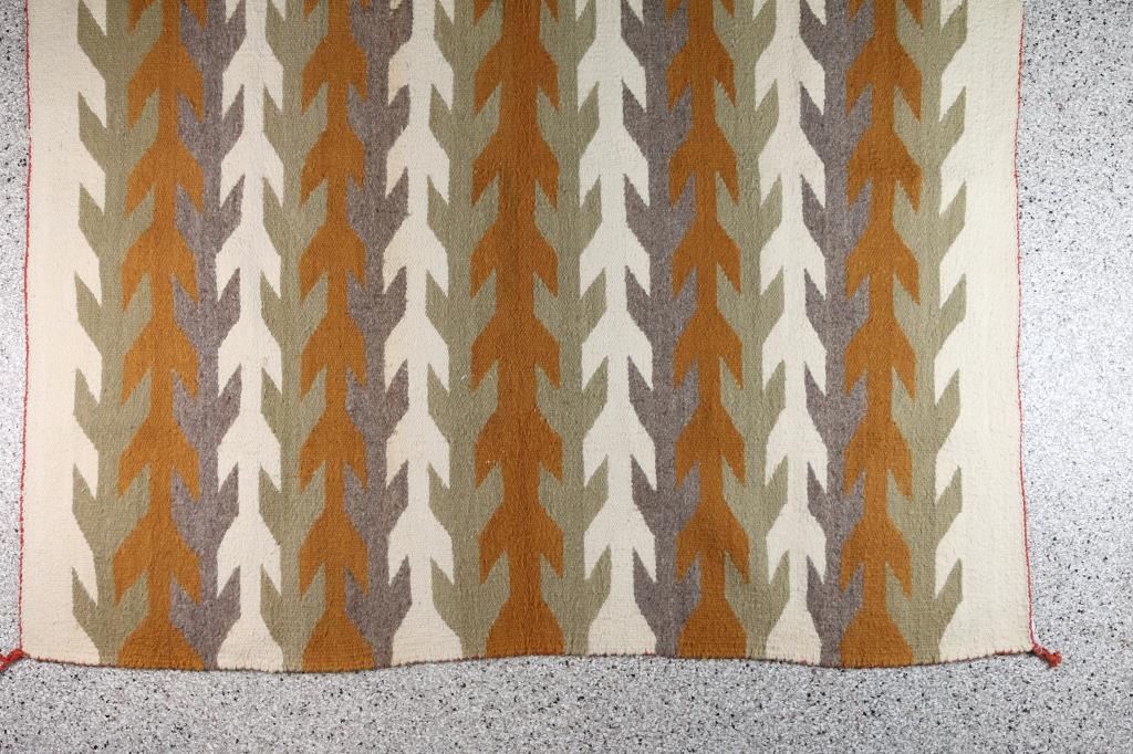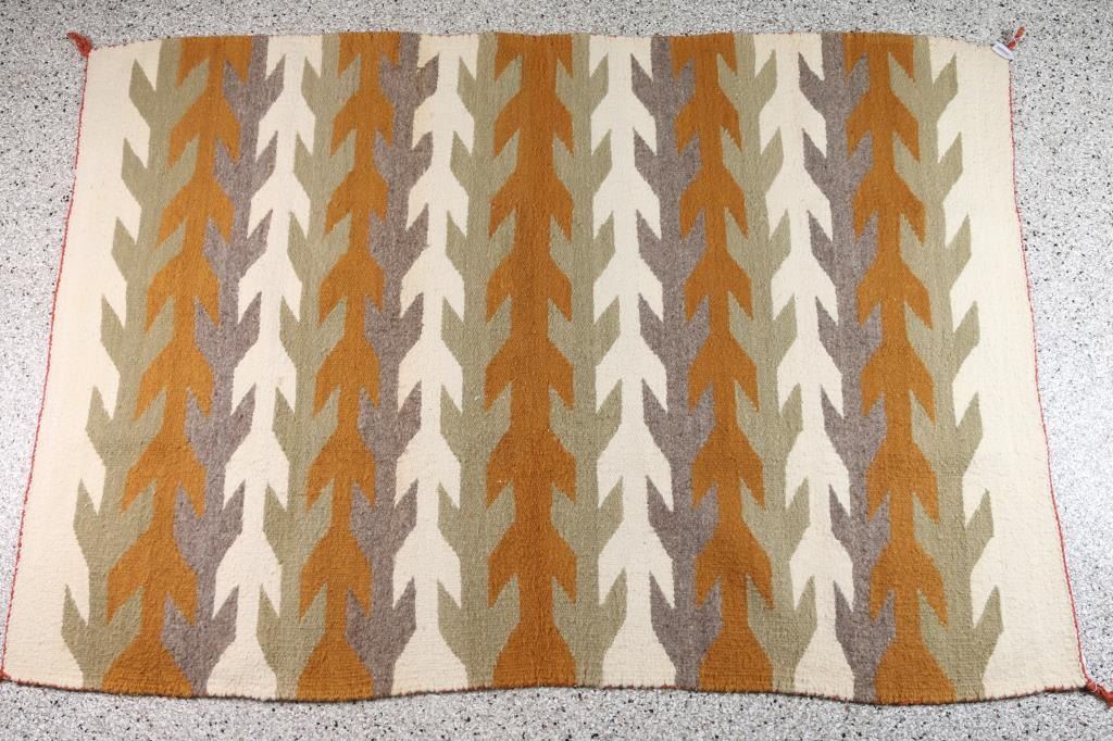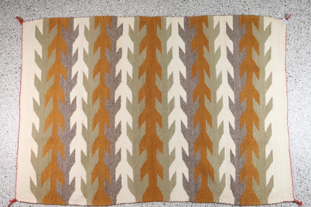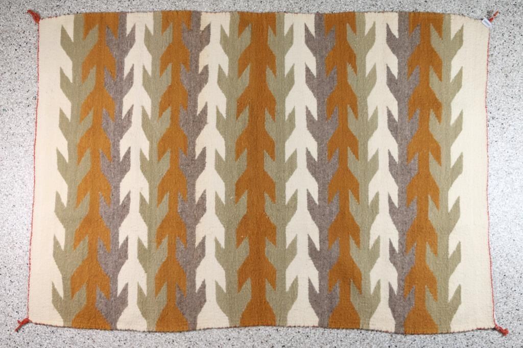 In sage green, grey, mustard. Measures 68" x 47". Condition is overall good. Very minor staining to white in one area.