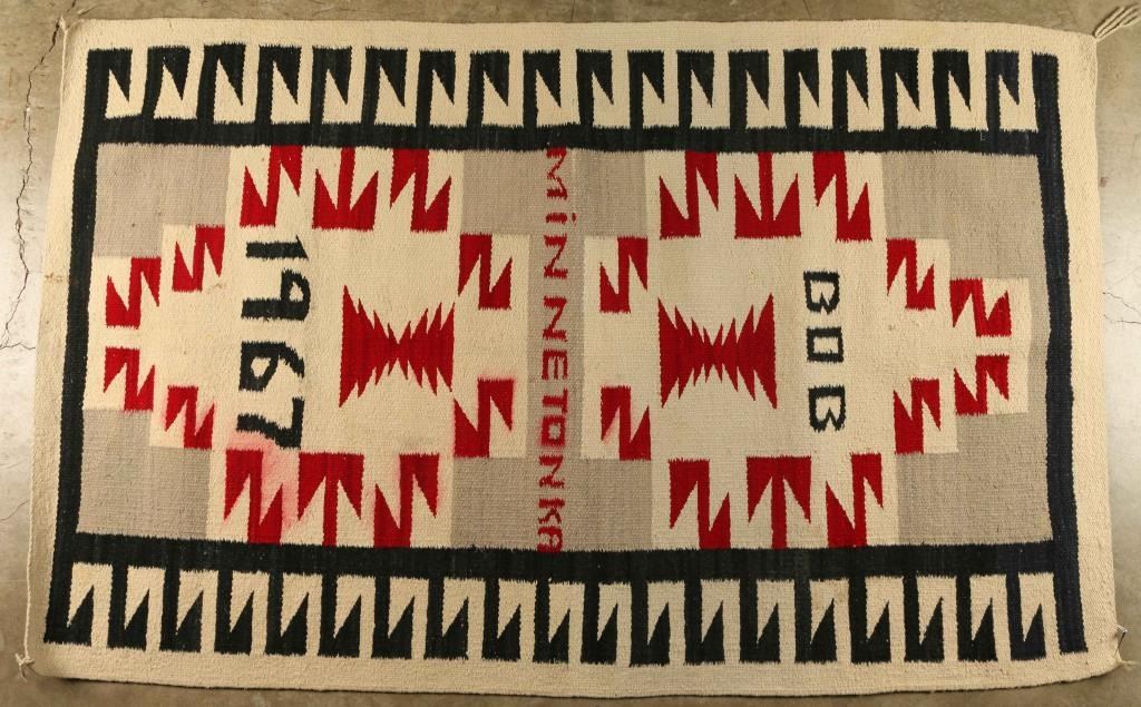 Red, black and white rug with geometric designs and 'Bob Minnetonka 1967' woven into it. Measures 58" x 36" with some bleeding of the red dye and a few stains, otherwise good.