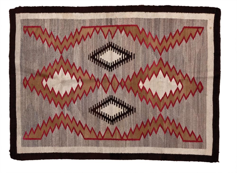 63 x 46 Serrated outlined diamonds and half diamonds and two floating diamonds in red, black, gold and white on a grey field with solid outside borders. Good condition, c. 1940s.