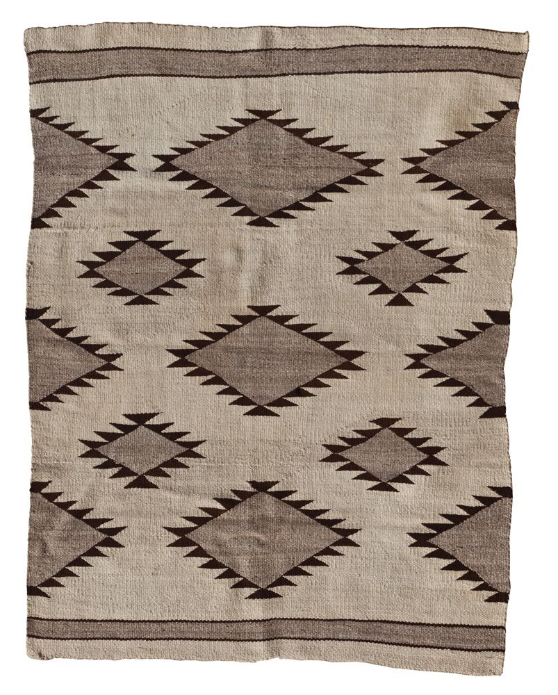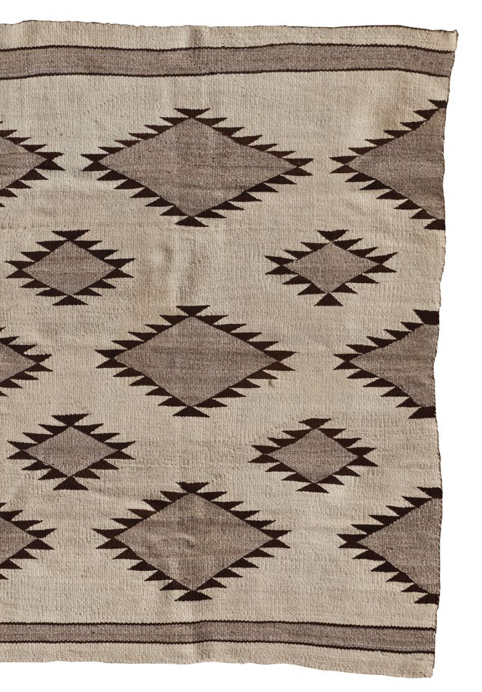 62” x 48” Crystal, native hand-spun wool in natural colors. Gray diamonds with dark brown serrated borders on cream background. Minor stabilization repairs at each corner, circa 1920s.