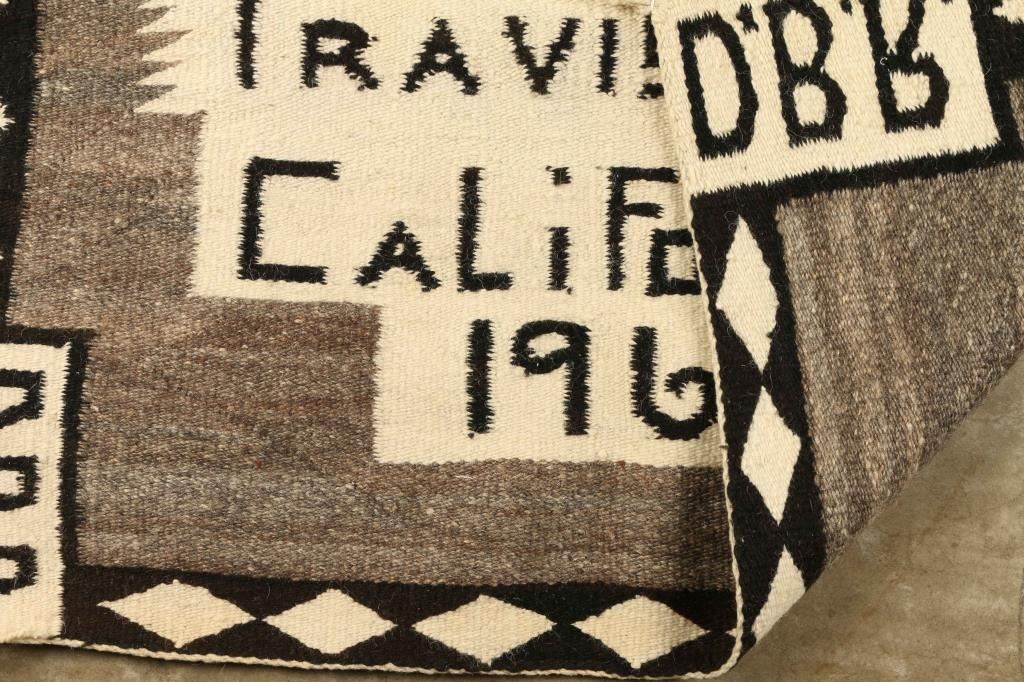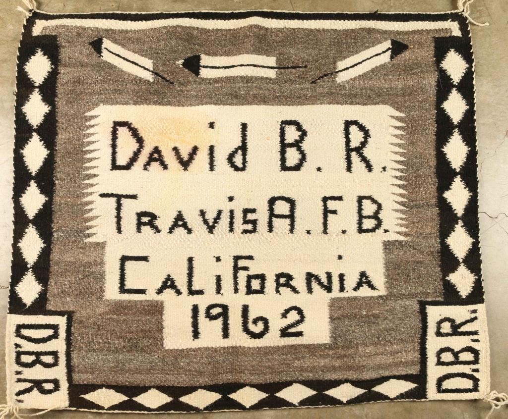 reads " David B.R. Travis A.F.B. California 1962". And "DBR" in corners. Gray black and white with feather design around lettering. The rug mentions Travis Air Force base we are not sure of the significance could have been made for a soldier. Measures 35"X25" Condition Good no holes or fraying